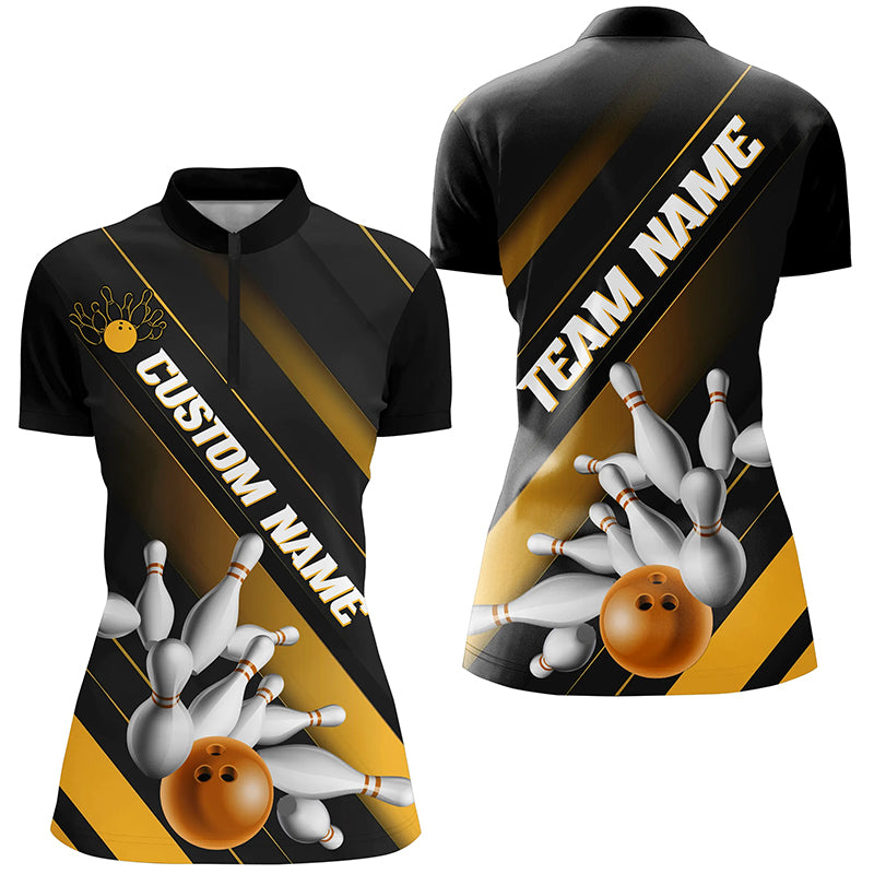 Black And Gold Custom Bowling Team Shirts For Women, Bowling Ball And Pins Shirt IPHW6445