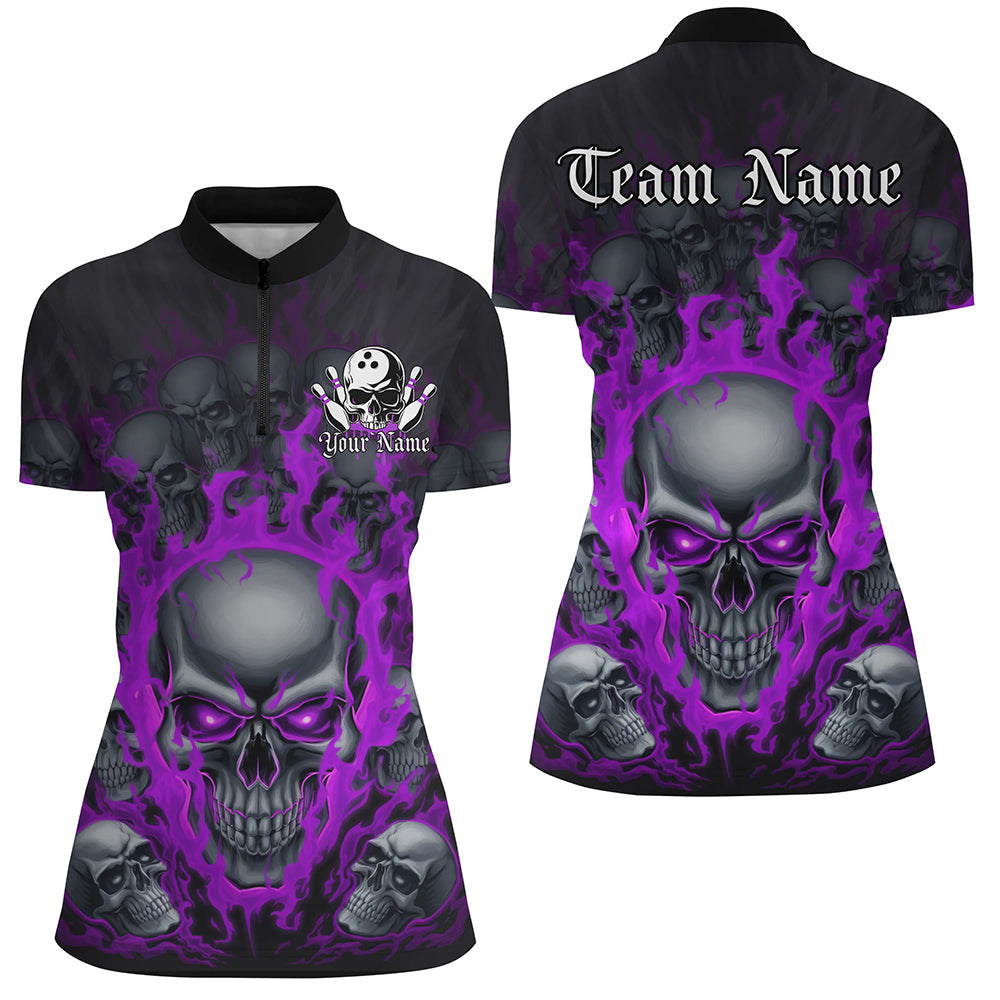 Custom Purple Flame Skull Bowling Shirts For Women, Halloween Bowling Team Outfits Uniform IPHW7390