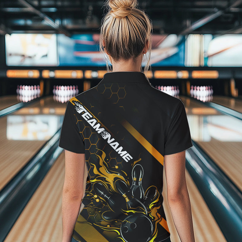 Custom Black And Gold Flame Bowling Shirts For Women, Bowling Team Bowling League Shirts IPHW7505