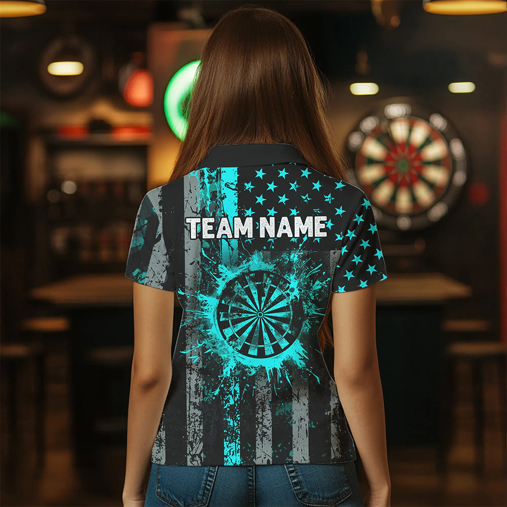 Custom Turquoise Grunge Us Flag Patriotic Darts Shirt For Women, Retro Darts Board Darts Team Jerseys TDM1648