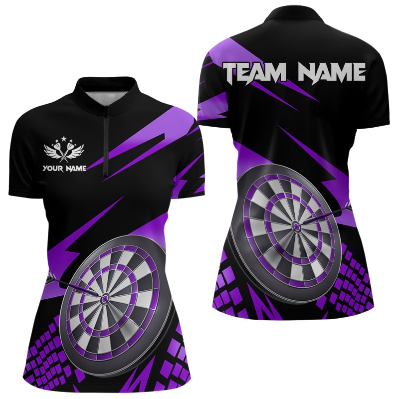 Purple Black Custom Dart Shirts For Women, Personalized 3D Darts Board Dart Jerseys Polo & 1/4 Zip TDM3141