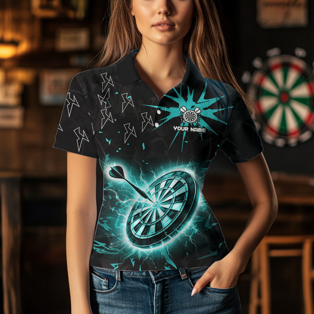 Custom Dart Jerseys For Women, Black And Turquoise Dartboard Thunder Lightning Darts Polo & 1/4 Zip TDM3667