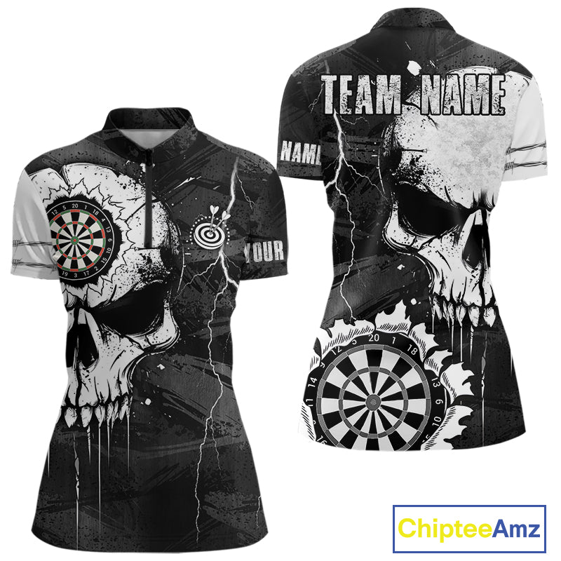 Custom Black And White Grunge Skull Dart Shirts For Women | Team Darts Jerseys - Polo & Quarter Zip TDM3955