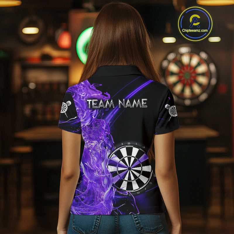 Custom Black And Purple Flame Darts Shirts For Women, Darts Team Jerseys Polo & Quarter Zip Uniform TDM4017