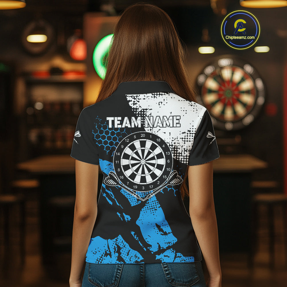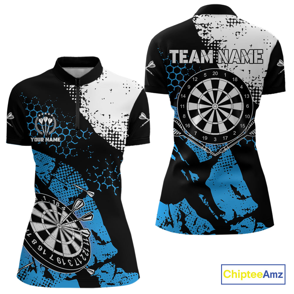 Retro Black Blue Grunge Pattern Darts Polo, Quarter Zip Custom Women Dart Shirt Team Dart Jersey TDM4040