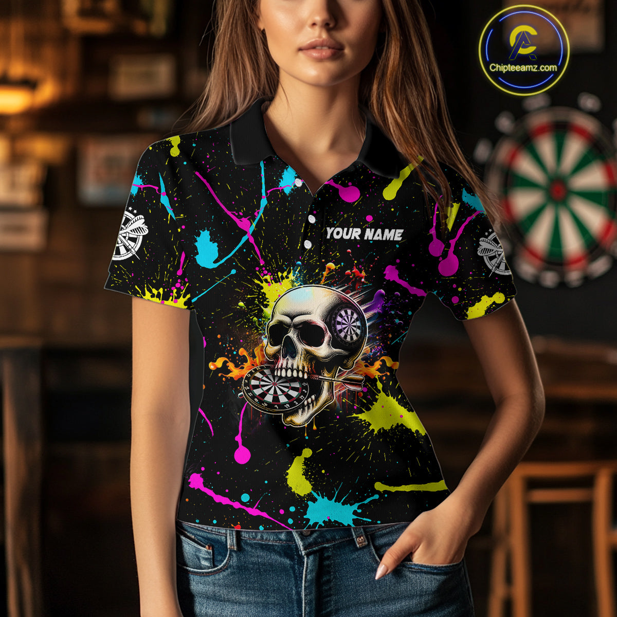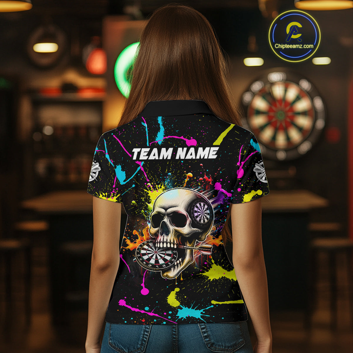 Personalized Funny Skull Colorful Paint Dart Shirt For Women Custom Darts Team Jersey Polo & 1/4 Zip TDM4213