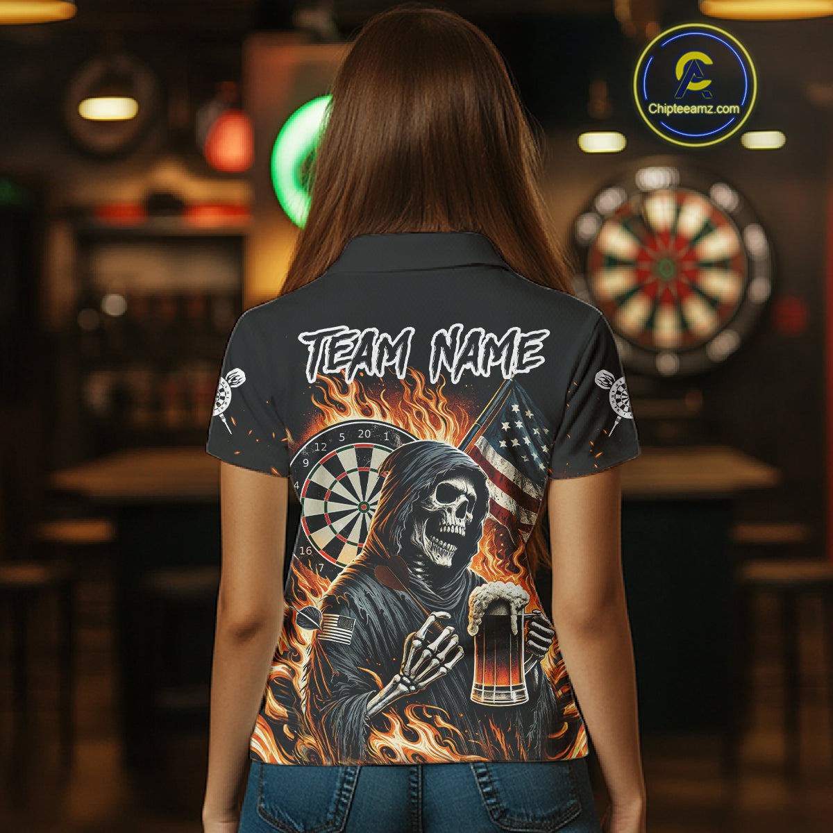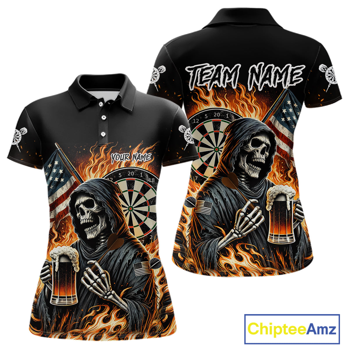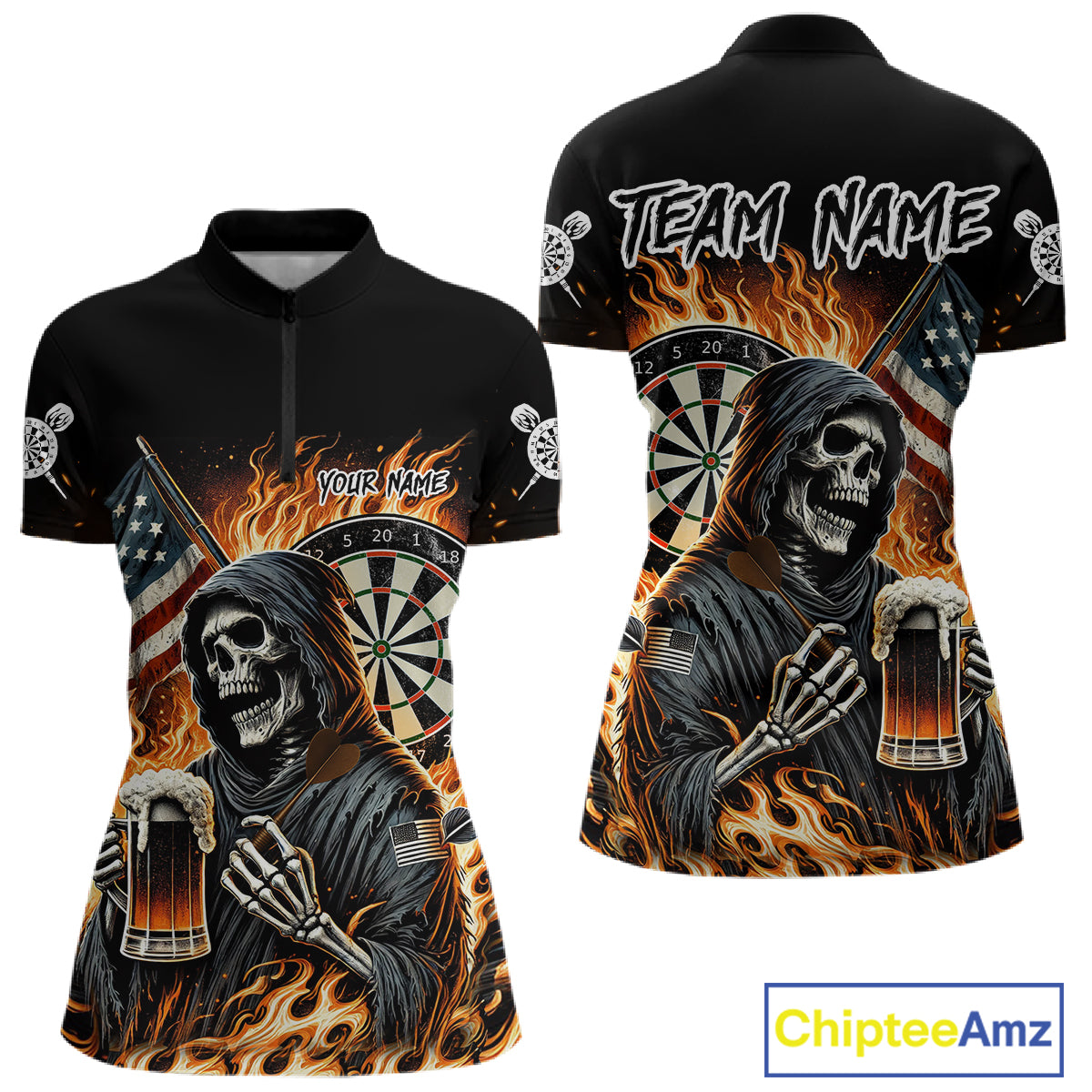 Flaming Grim Reaper Beer Darts Shirt Custom US Flag Darts Polo & Quarter Zip Jerseys For Women TDM4526