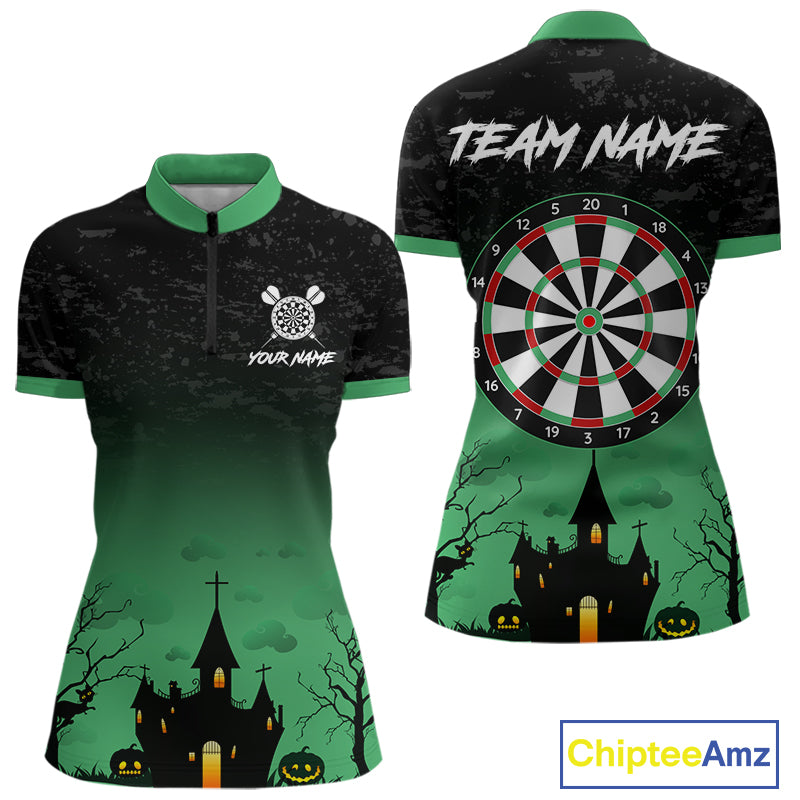 Custom Black And Green Halloween Darts Shirt For Women, Darts Jerseys Outfit Team Polo & 1/4 Zip TDM4566