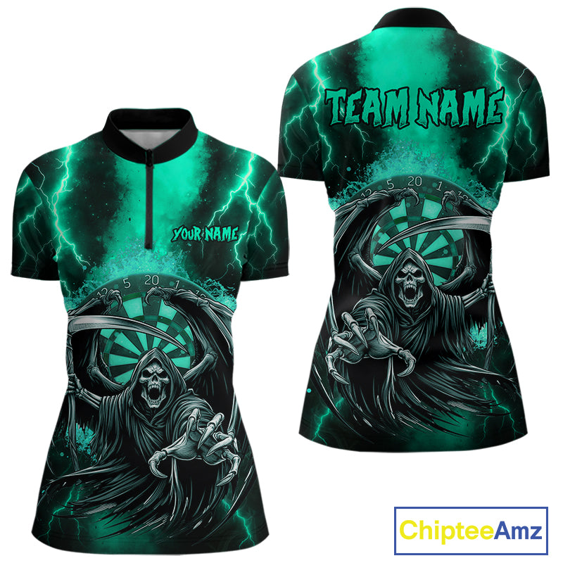 Personalized Turquoise Grim Reaper Thunder Lightning Darts Shirt For Women, 3D Darts Team Jerseys TDM4589