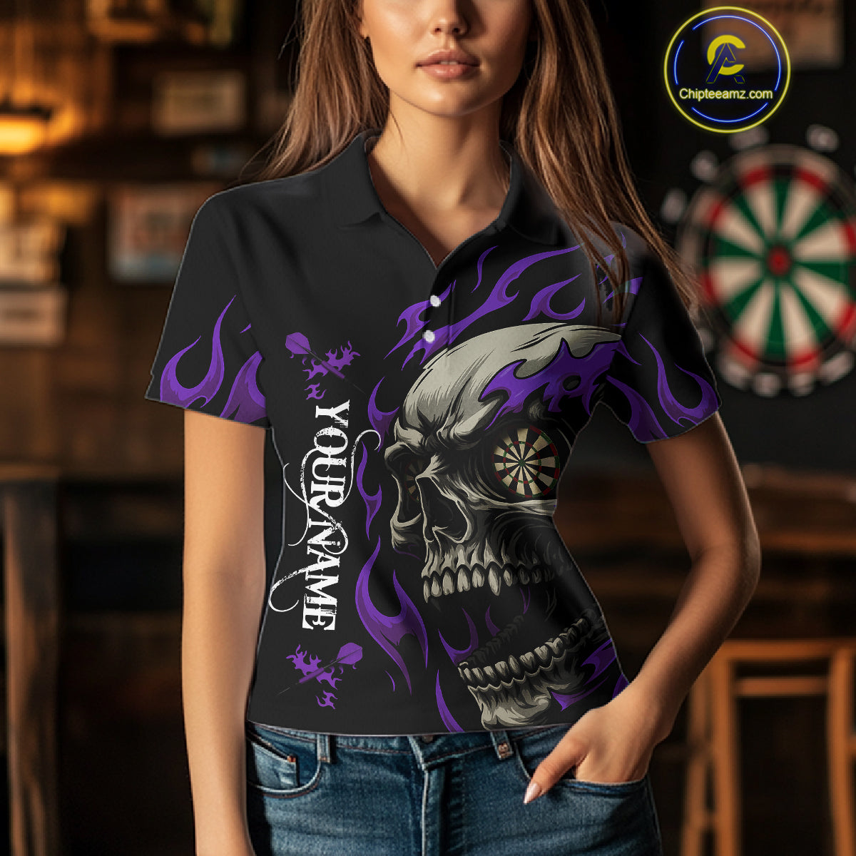 Personalized Purple Flaming Skull Darts Shirt For Women Custom Darts Jersey Team Polo & 1/4 Zip TDM4764