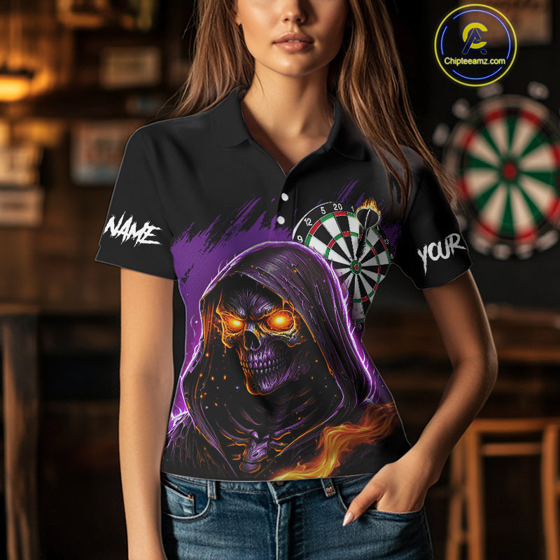 Personalized Purple Death Skeleton Fire Dart Shirt For Women Custom Skull Dart Jersey Polo & 1/4 Zip TDM4893