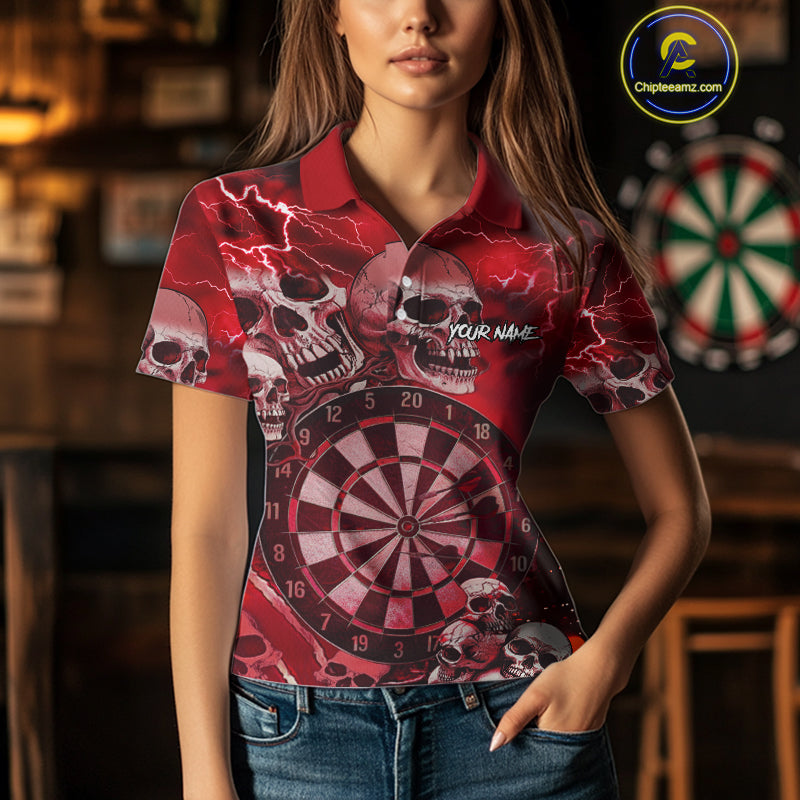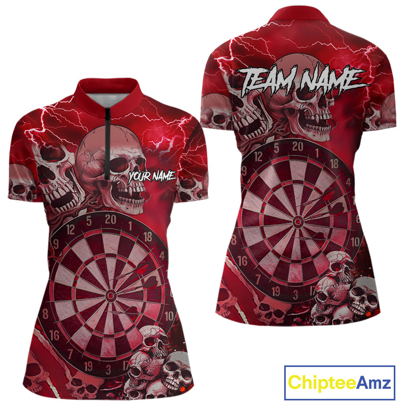 Red Funny Skull Lightning Darts Shirt For Women Custom Darts Team Jersey Polo & Quarter Zip TDM4981