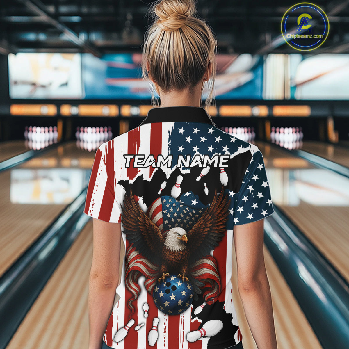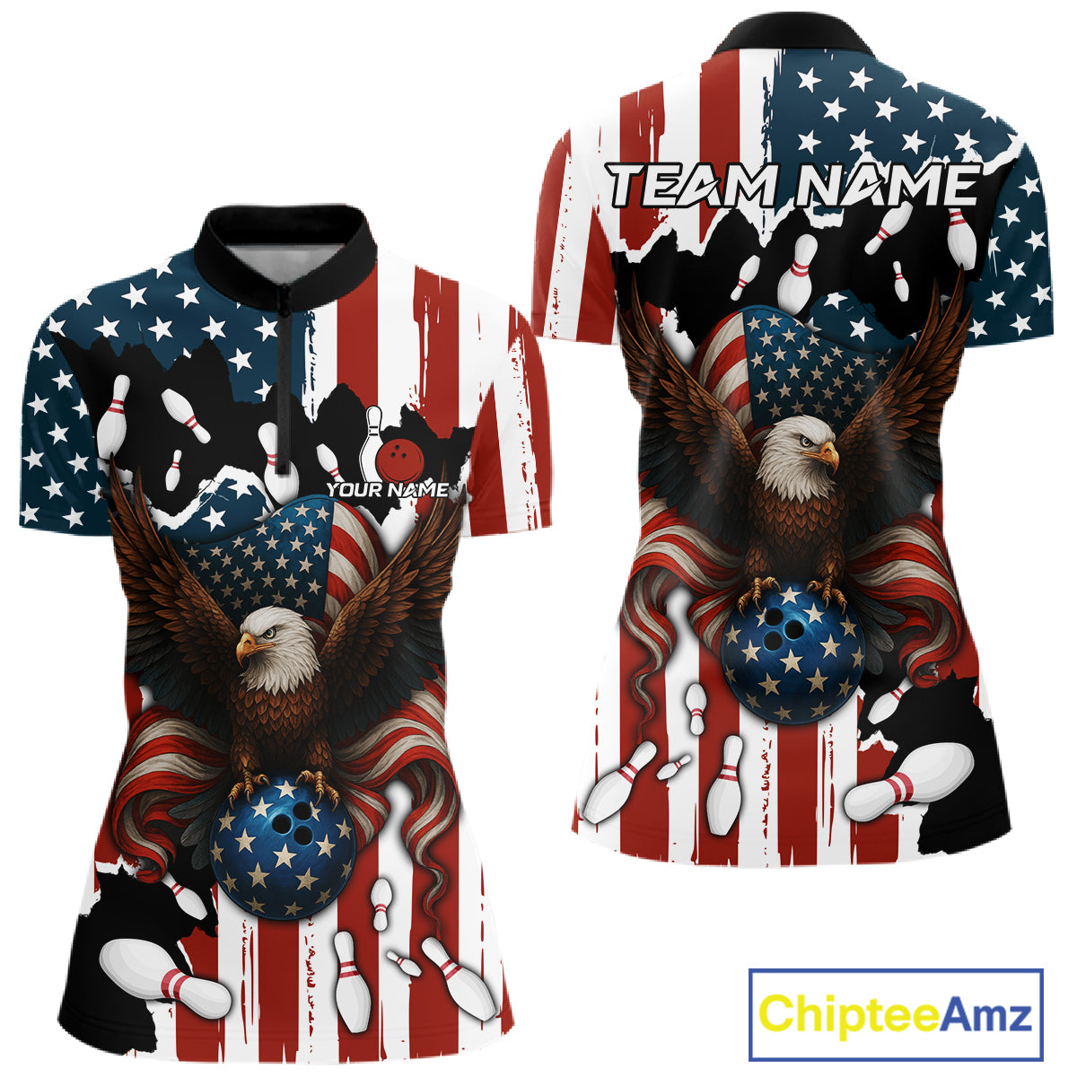 American Flag Eagle Bowling Polo, Quarter Zip Shirts For Women Custom Patriotic Team Bowling Jersey NQS10572