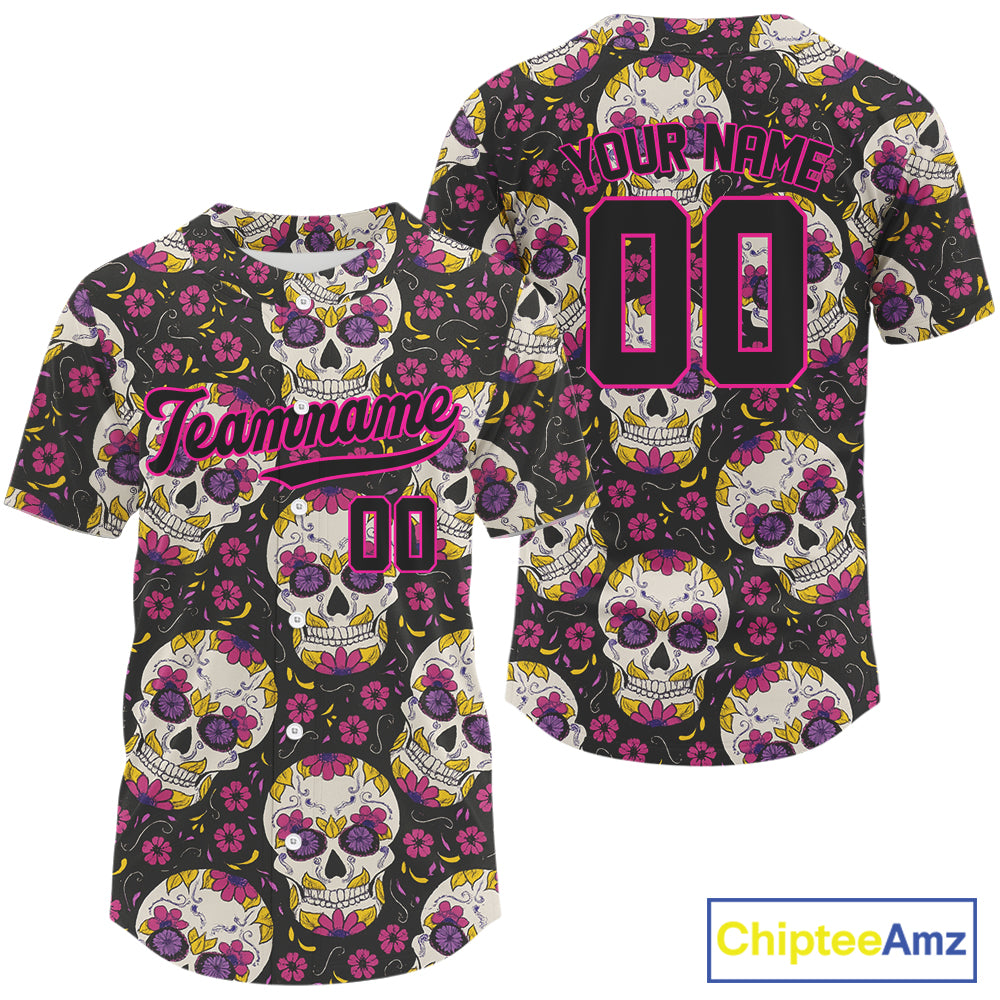 Custom Black And Pink Skull Halloween Baseball Jersey For Men Creepy Baseball Jersey NYN1286