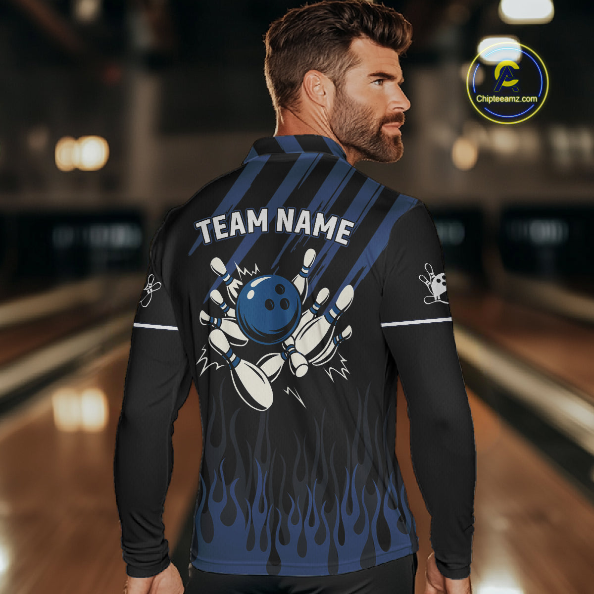 Black and Blue Flame Retro Bowling Polo, Quarter Zip Shirt for Men Custom Vintage Team Bowling Jersey NQS10504