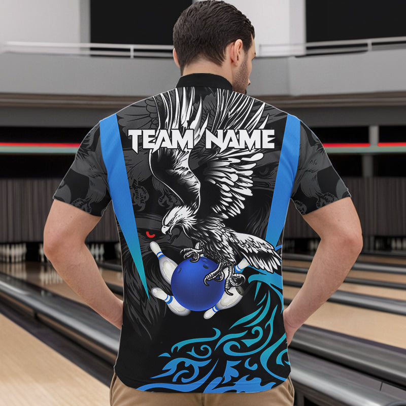 Black and Blue Tribal Eagle Bowling Polo, Quarter Zip Shirts For Men Custom Eagle Bowling Team Shirt NQS9716