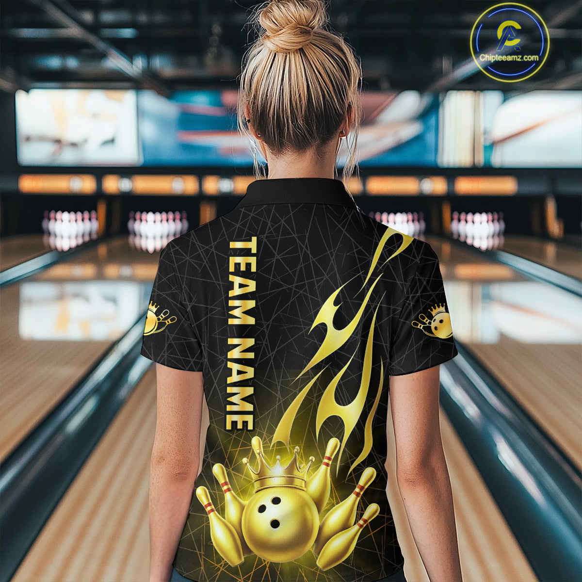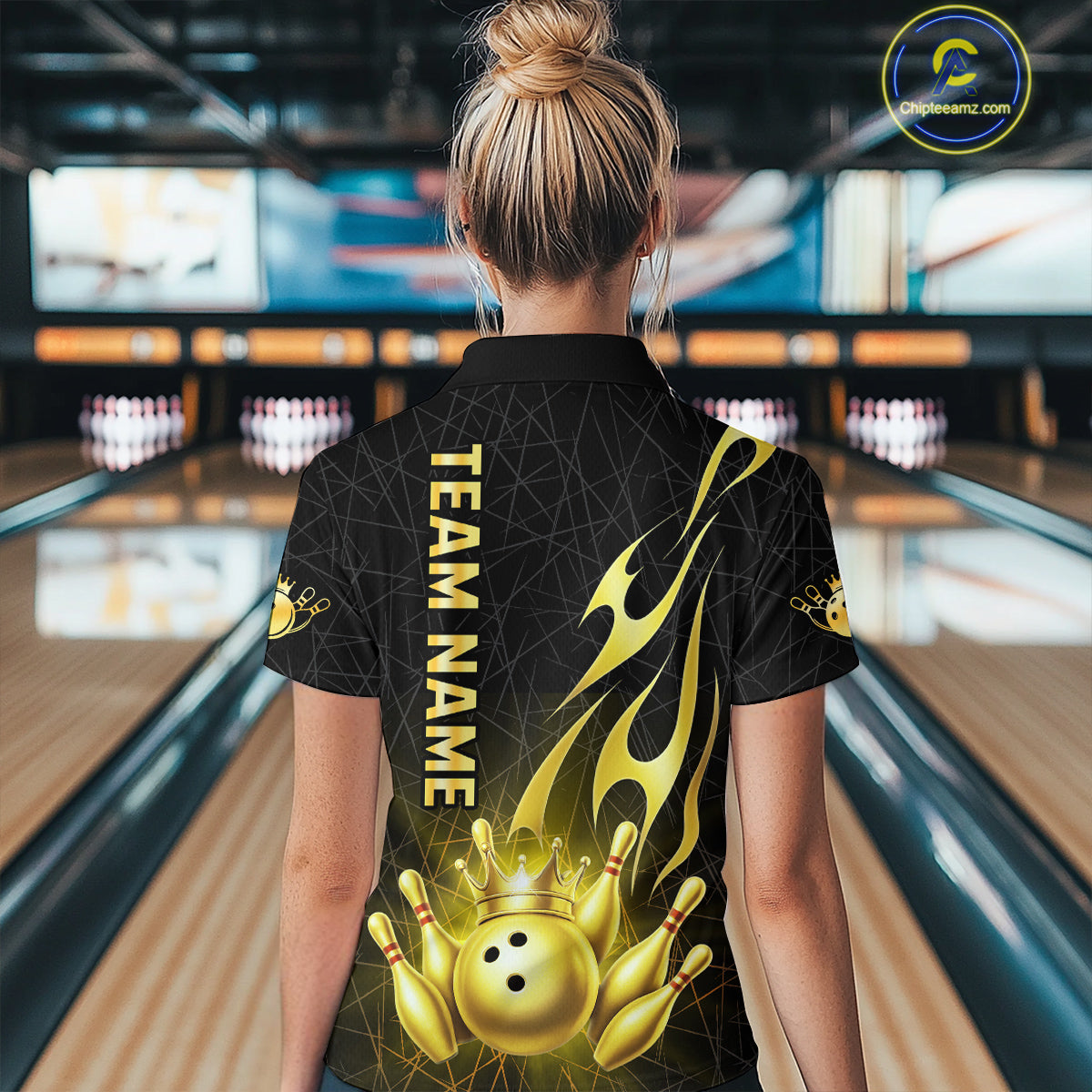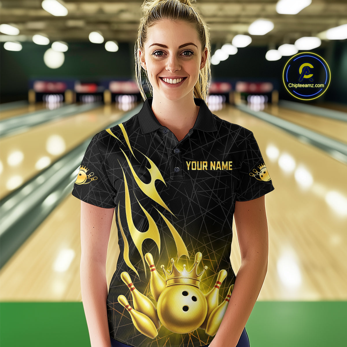 Black and Gold Flame Bowling Shirts For Women Custom Bowling Team League Jersey, Gift For Bowler NQS10439