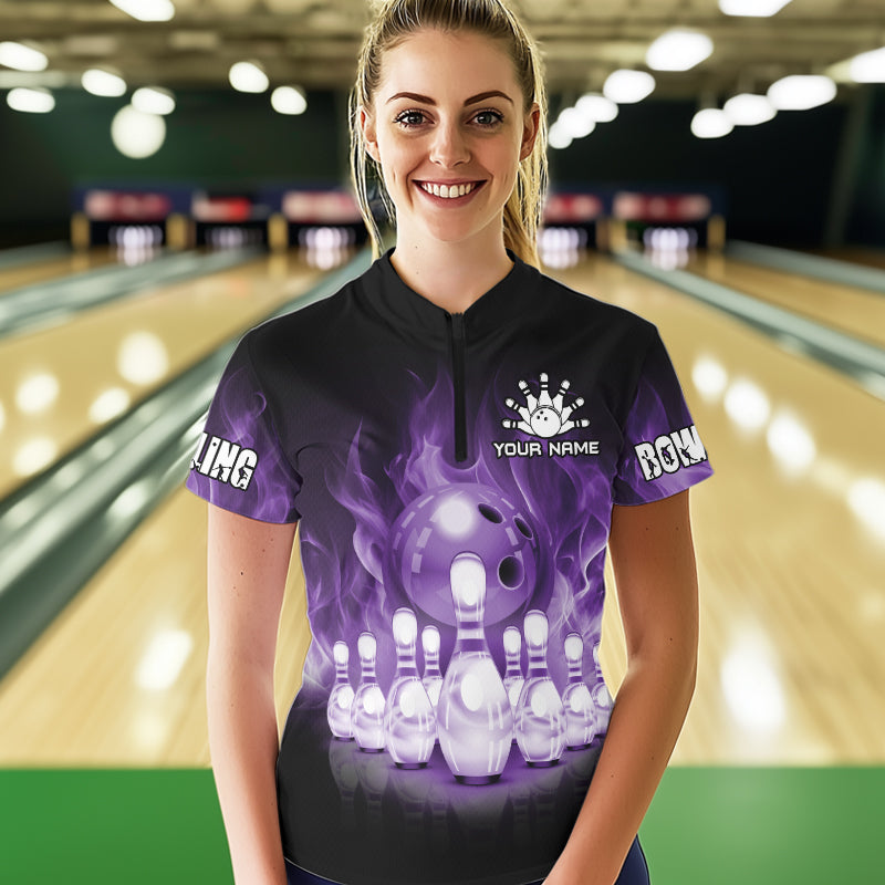 Black And Purple Flame Bowling ball pins Custom Bowling Shirts For Women, Bowling Team Shirt NQS9741