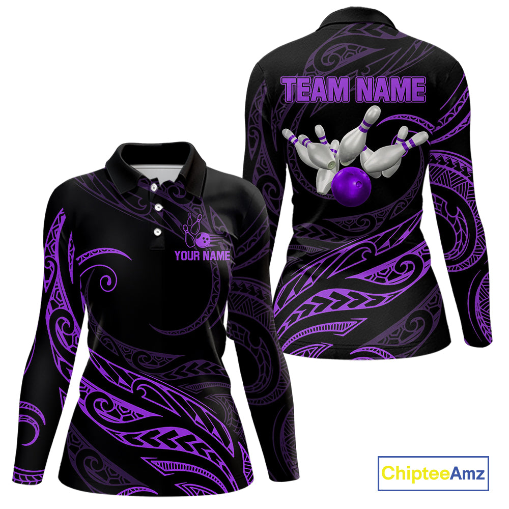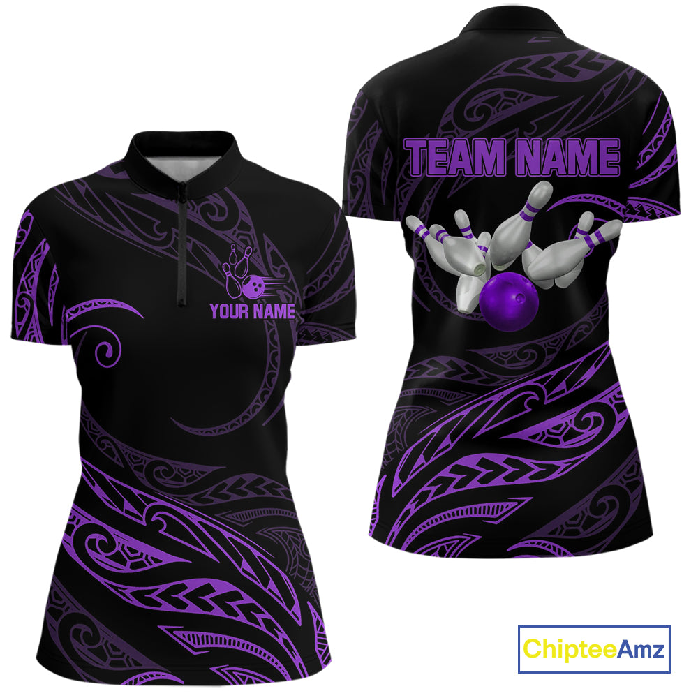 Black and Purple Tribal Pattern Bowling Polo, Quarter Zip shirts For Women Custom Team Bowling Jersey NQS10486