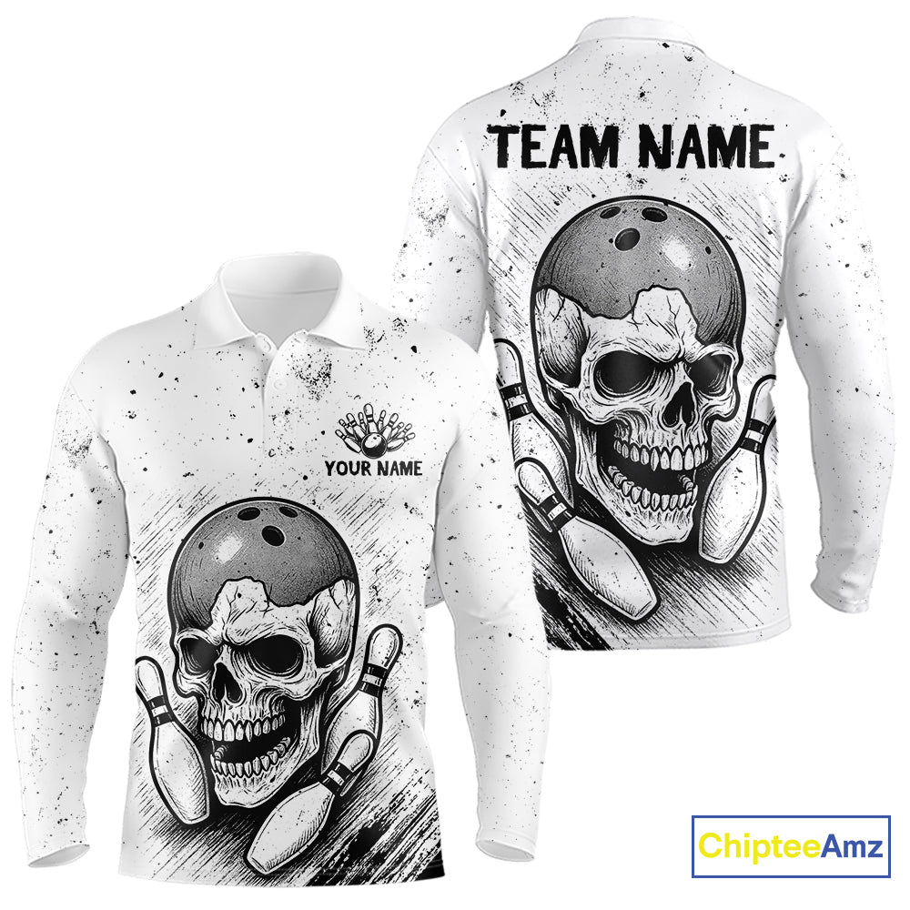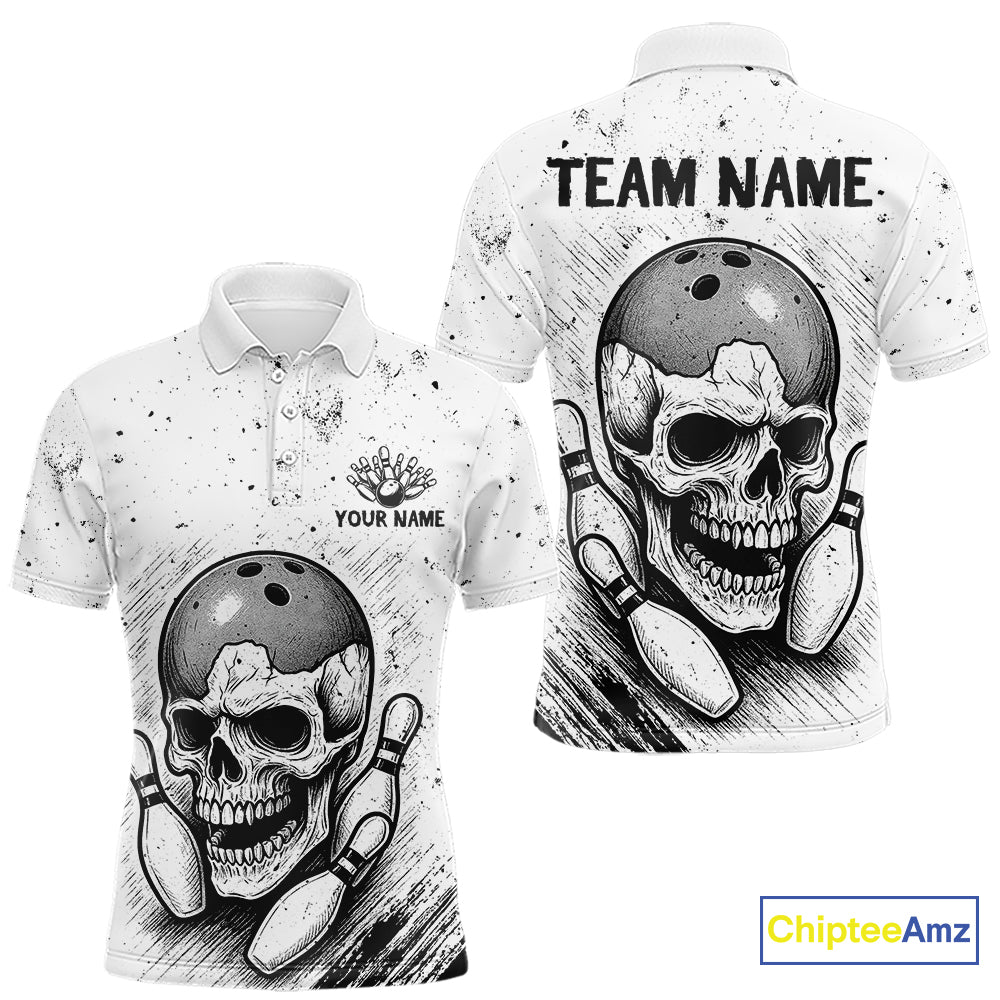 Black and White Grunge Skull Bowling Polo, 1/4 Zip Shirts For Men Custom Skull team bowling jerseys NQS9854