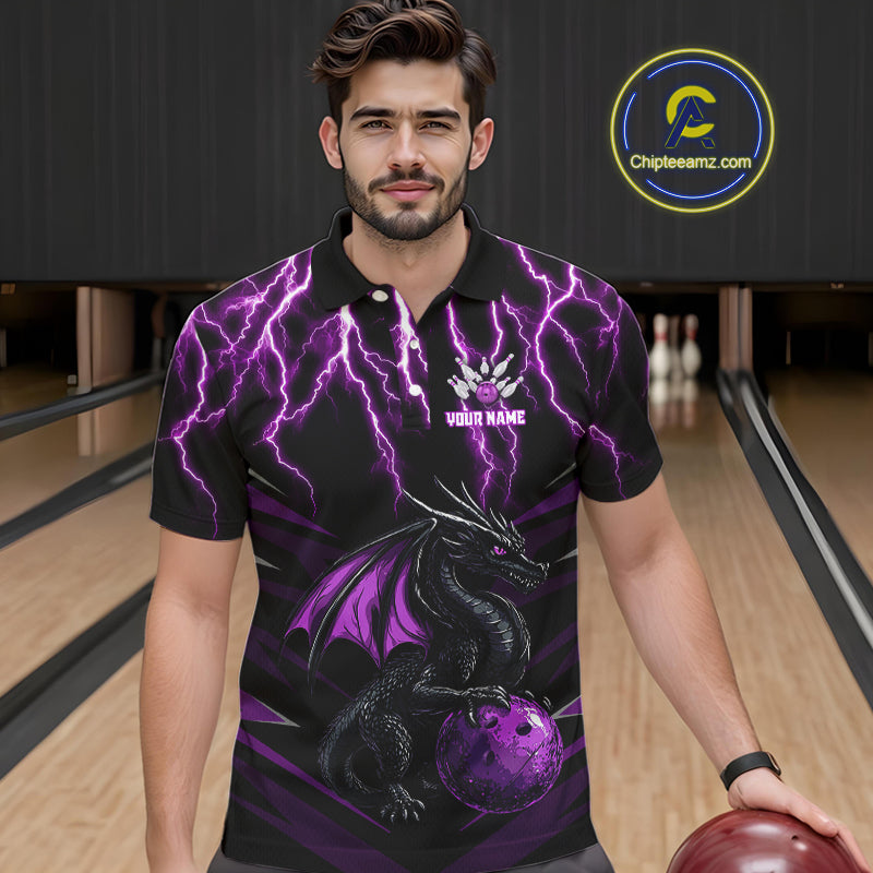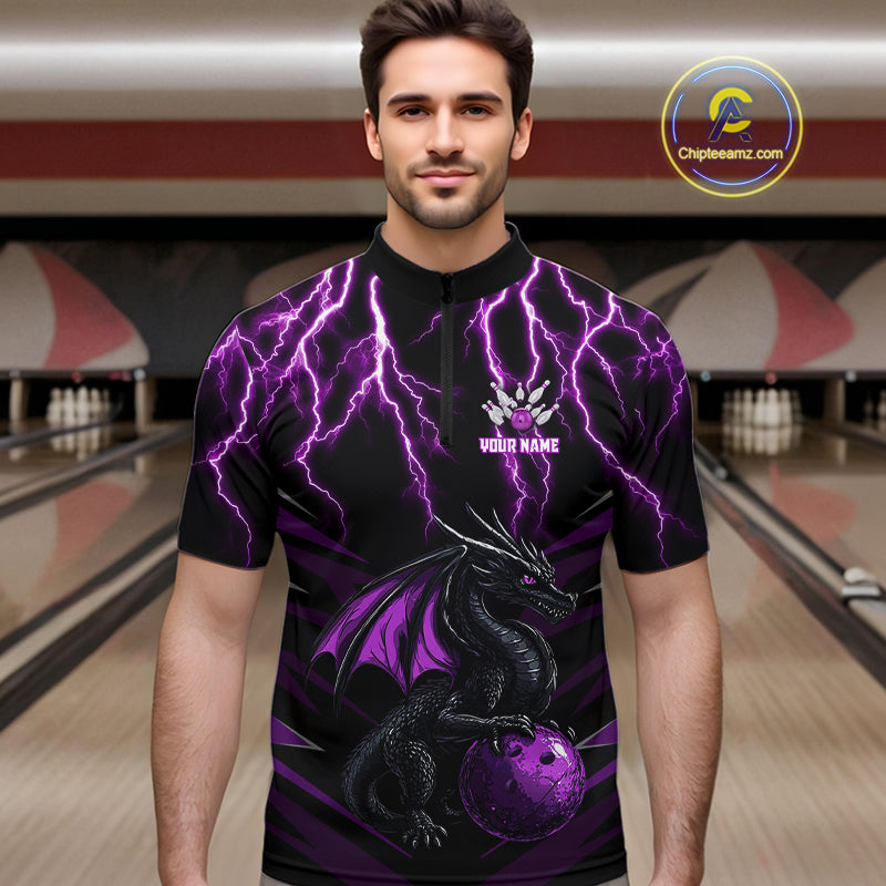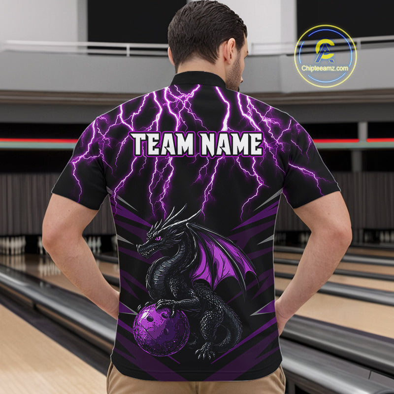 Black & Purple Lightning Thunder Dragon Bowling Shirt For Men Custom Dragon Bowling Team Shirt Uniform NQS9805
