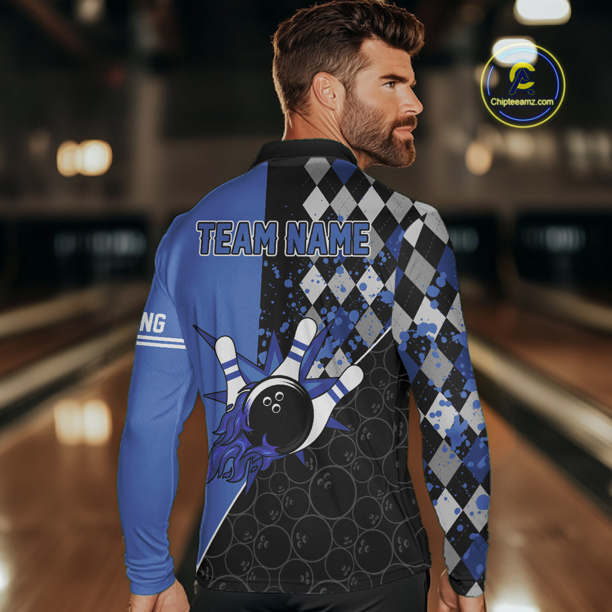 Custom Black and Blue argyle pattern flame Bowling Team Jerseys, Bowling Polo, 1/4 Zip Shirt for Men NQS10451