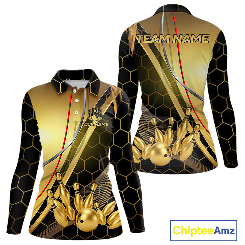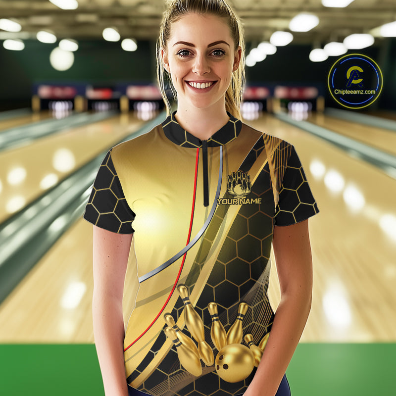 Custom Black and Gold Bowling Polo, Quarter Zip Shirts For Women, Bowling Team League Jersey NQS10346
