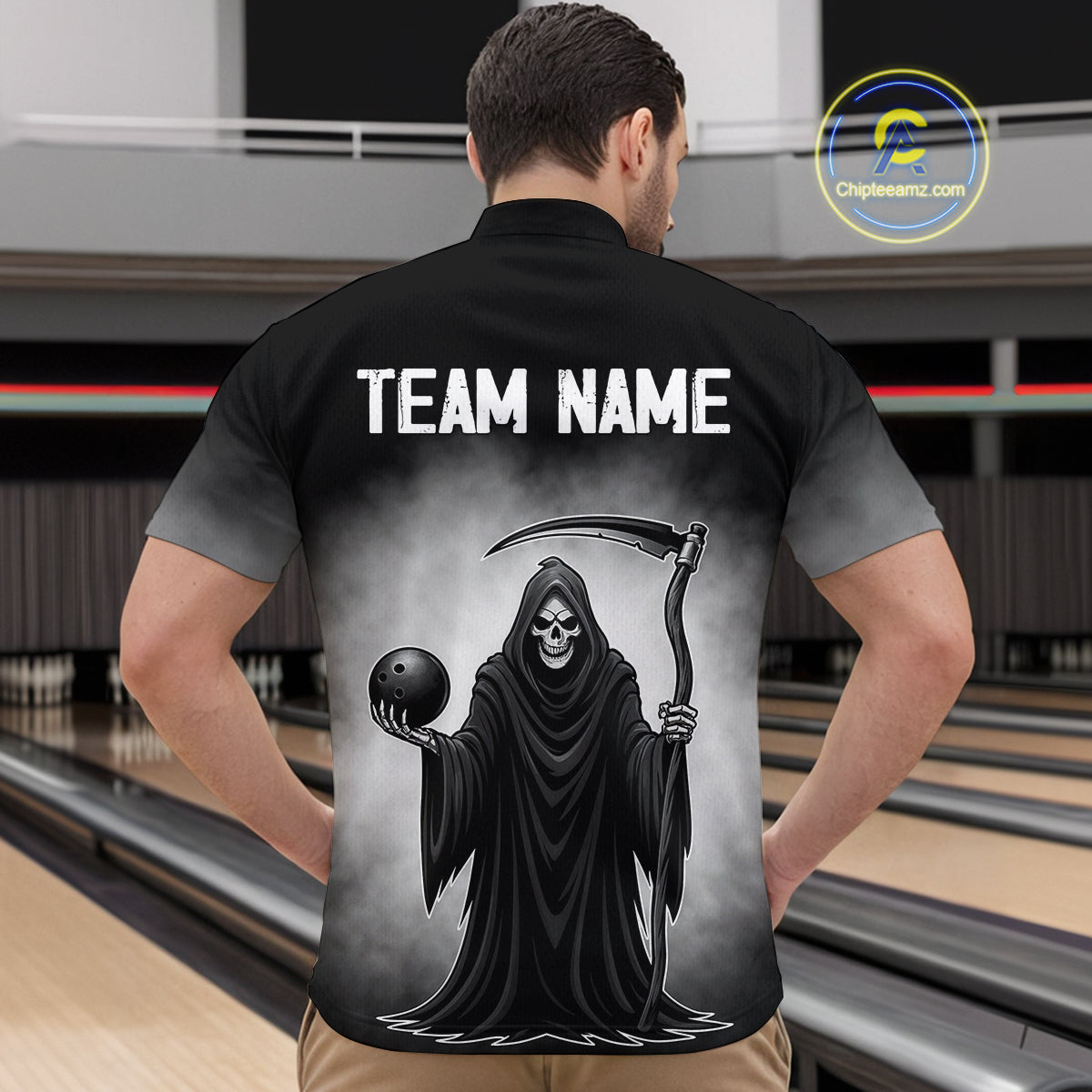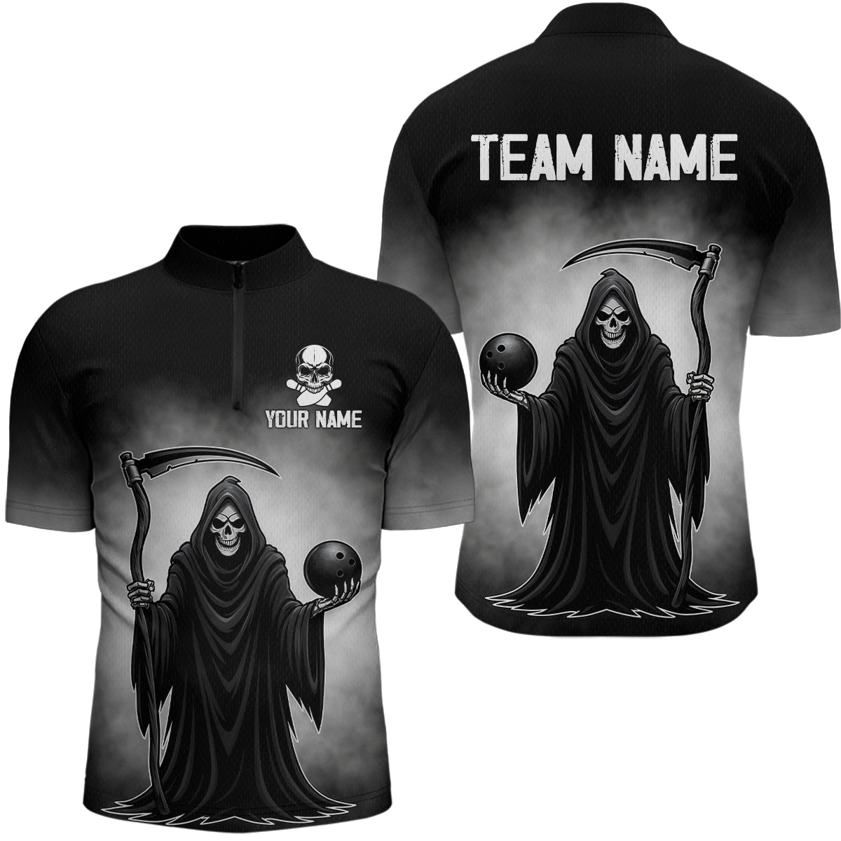Custom Black Skeleton Bowling Jersey for Men Bowling Uniform Polo & 1/4 Zip Bowling Team Shirts HNT110