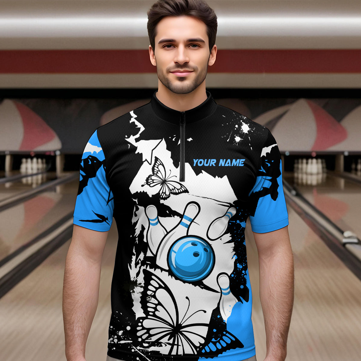 Custom Blue Butterflies Bowling Shirt for Men Women Team Bowling Polo&Quater Zip MBL76