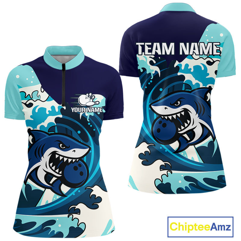 Custom Blue Shark Bowling Polo, Quarter Zip Shirts For Ladies, Personalized Shark Bowling Team Shirt NQS10469
