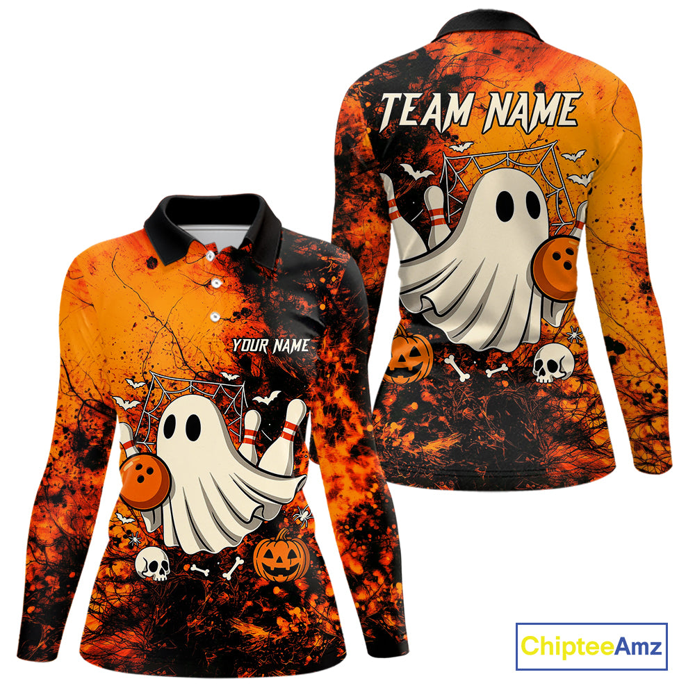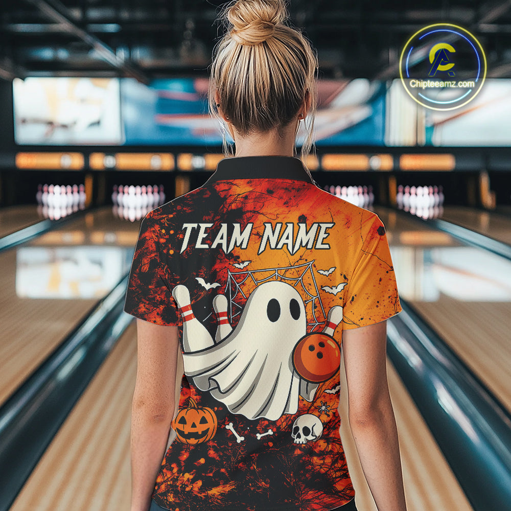 Custom Orange Boo Bowling Women Polo, Quarter Zip Shirts Bowling League Team Jersey Halloween Outfits NQS10523