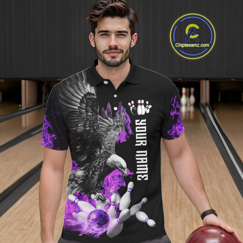Custom Purple Flame Black Eagle Bowling Polo, Quarter Zip Shirt For Men, Team Bowling Clothes NQS10351