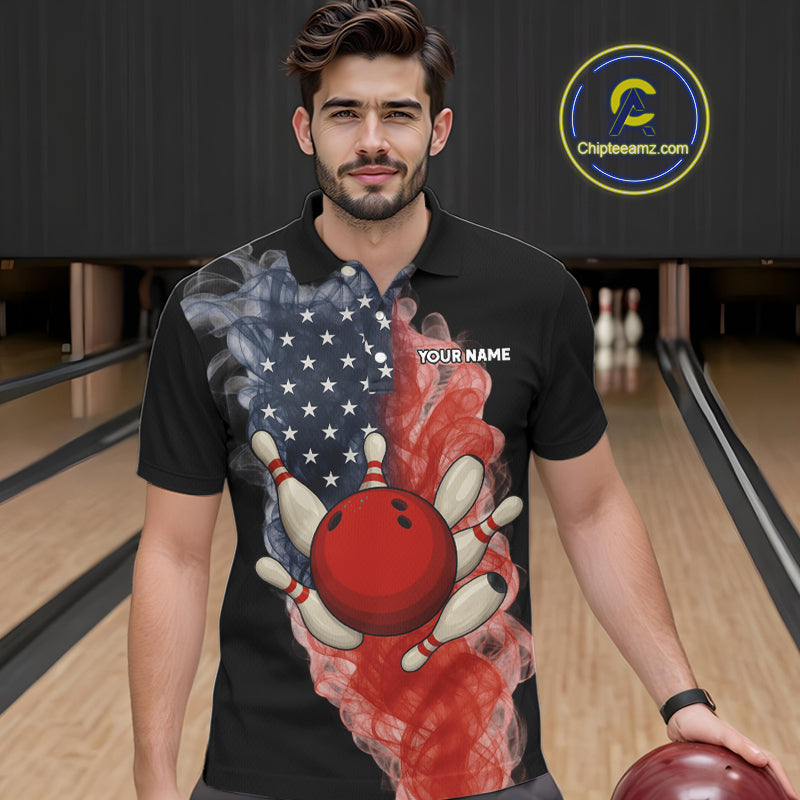 Custom Smoke American Flag Black Bowling Shirts for Men Personalized Patriotic Team Bowling Jerseys NQS10496