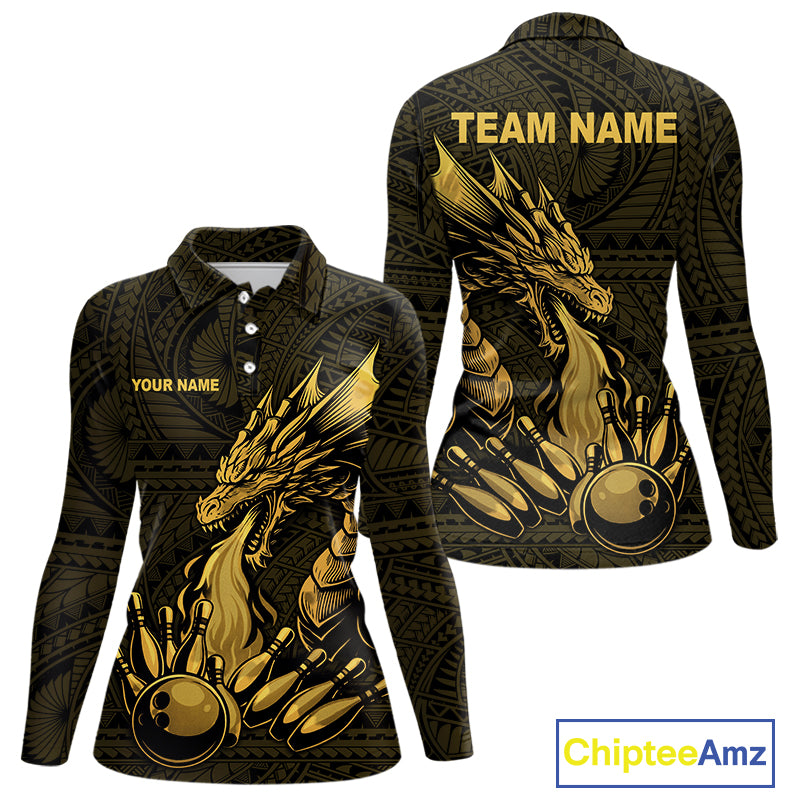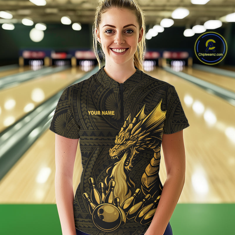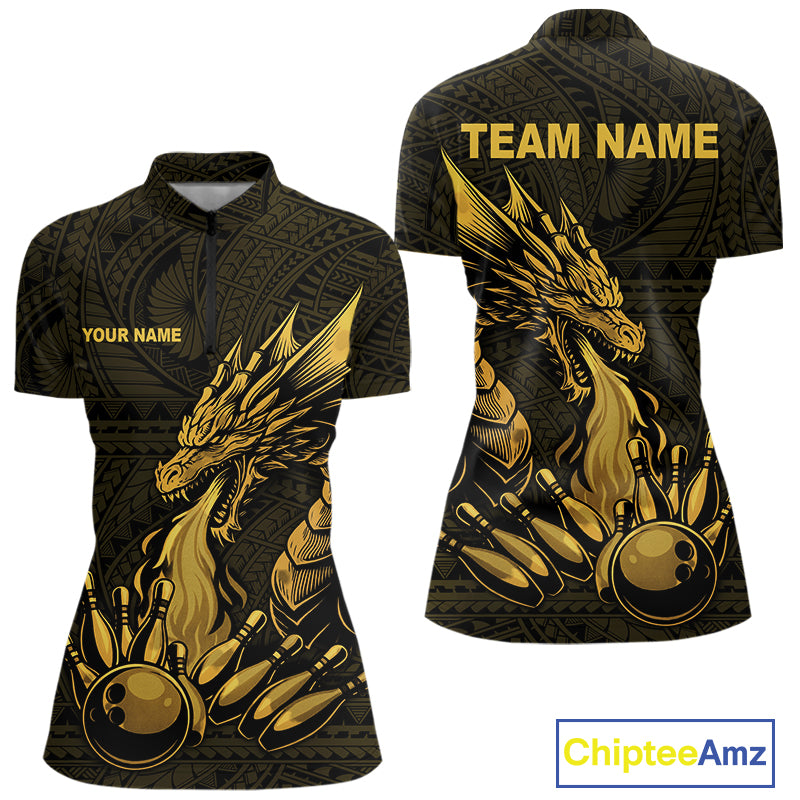 Custom Tribal pattern Gold Dragon Bowling Polo, 1/4 Zip Shirt For Women, Bowling Team League Jersey NQS10349