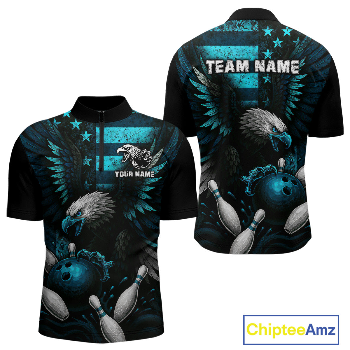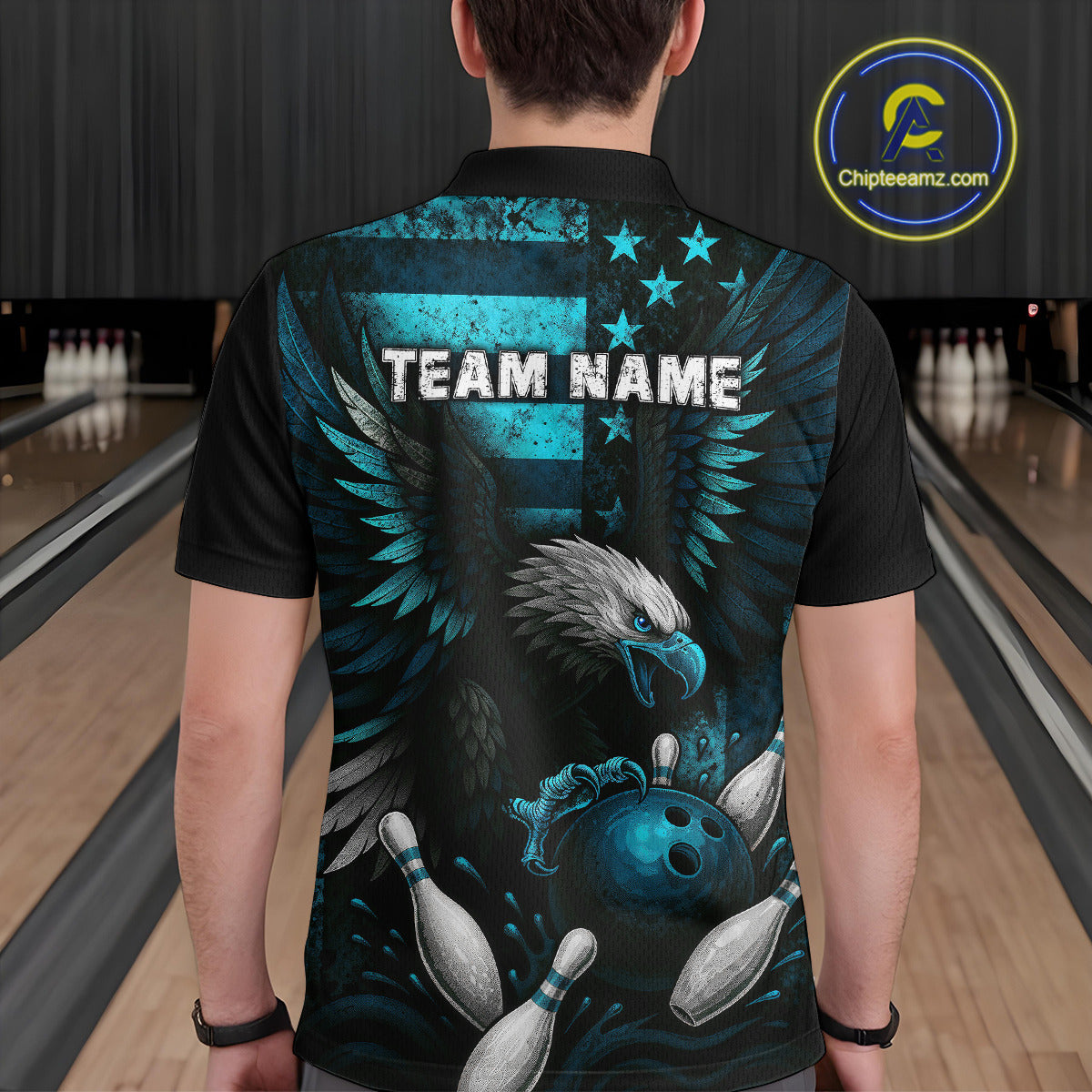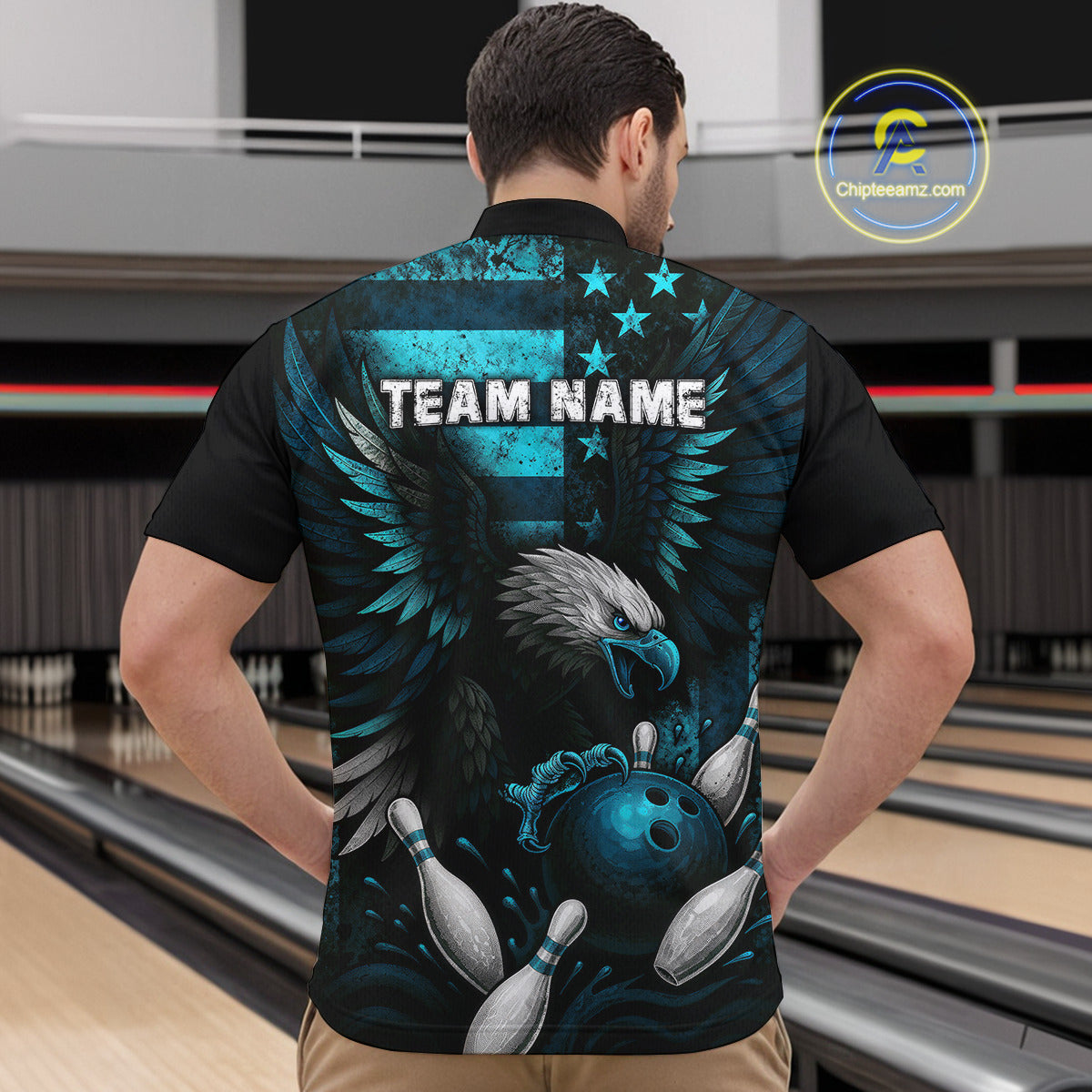 Custom Turquoise Vintage Us Flag Patriotic Eagle Bowling Shirt For Men, Retro Bowling Team Jerseys NQS10477
