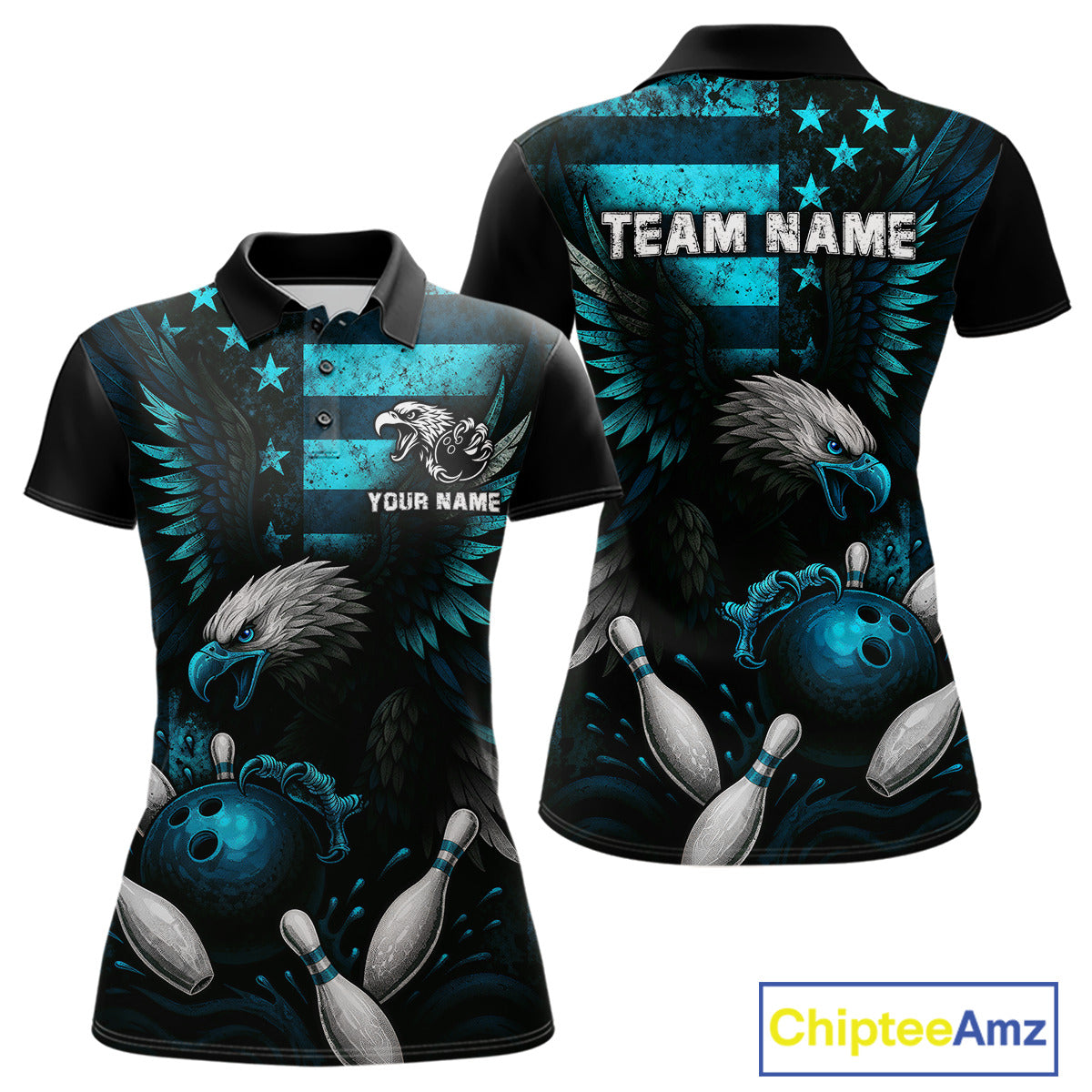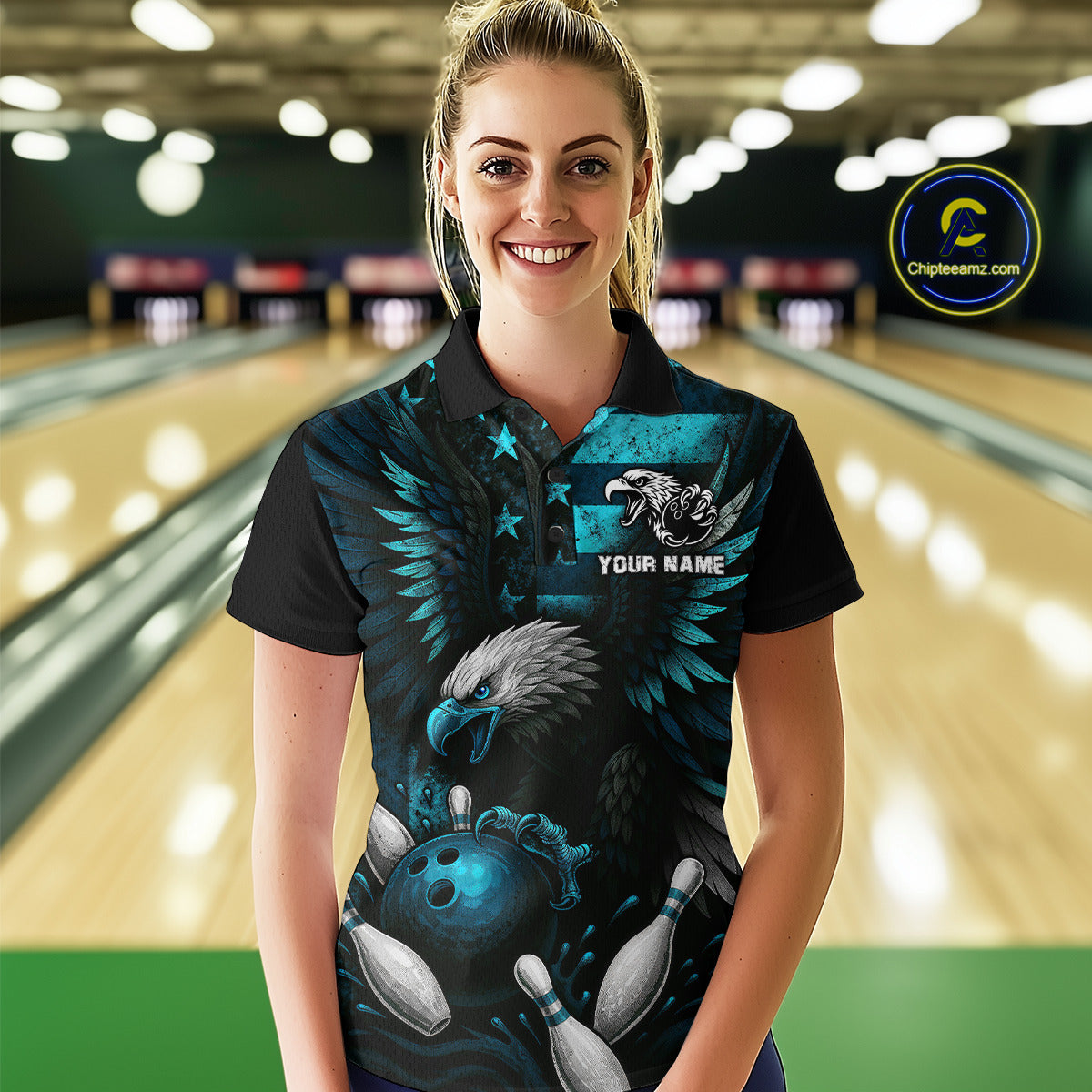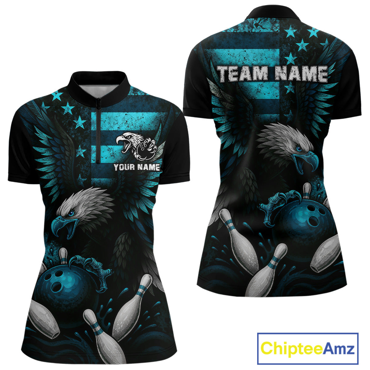 Custom Turquoise Vintage Us Flag Patriotic Eagle Bowling Shirt For Women, Retro Bowling Team Jerseys NQS10477