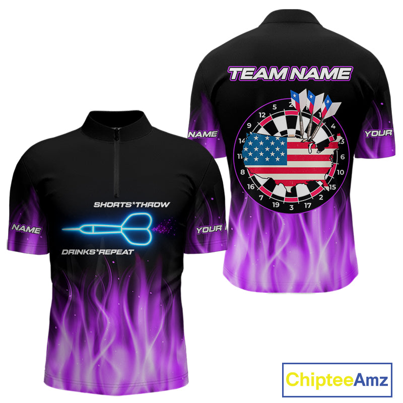 Custom Purple Flames Patriotic Dart Shirt For Men American Flag Dart Team Jerseys NYN1053