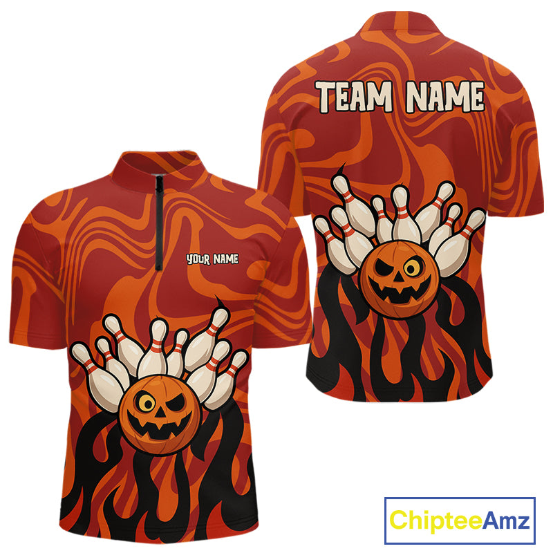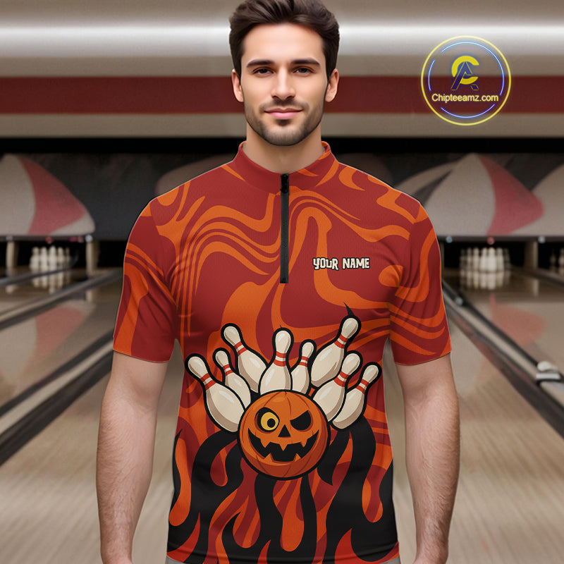 Orange camo flame Bowling polo, quarter zip shirts for men custom Halloween Bowling team jerseys NQS10395