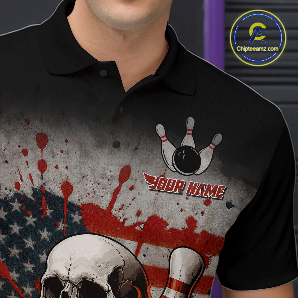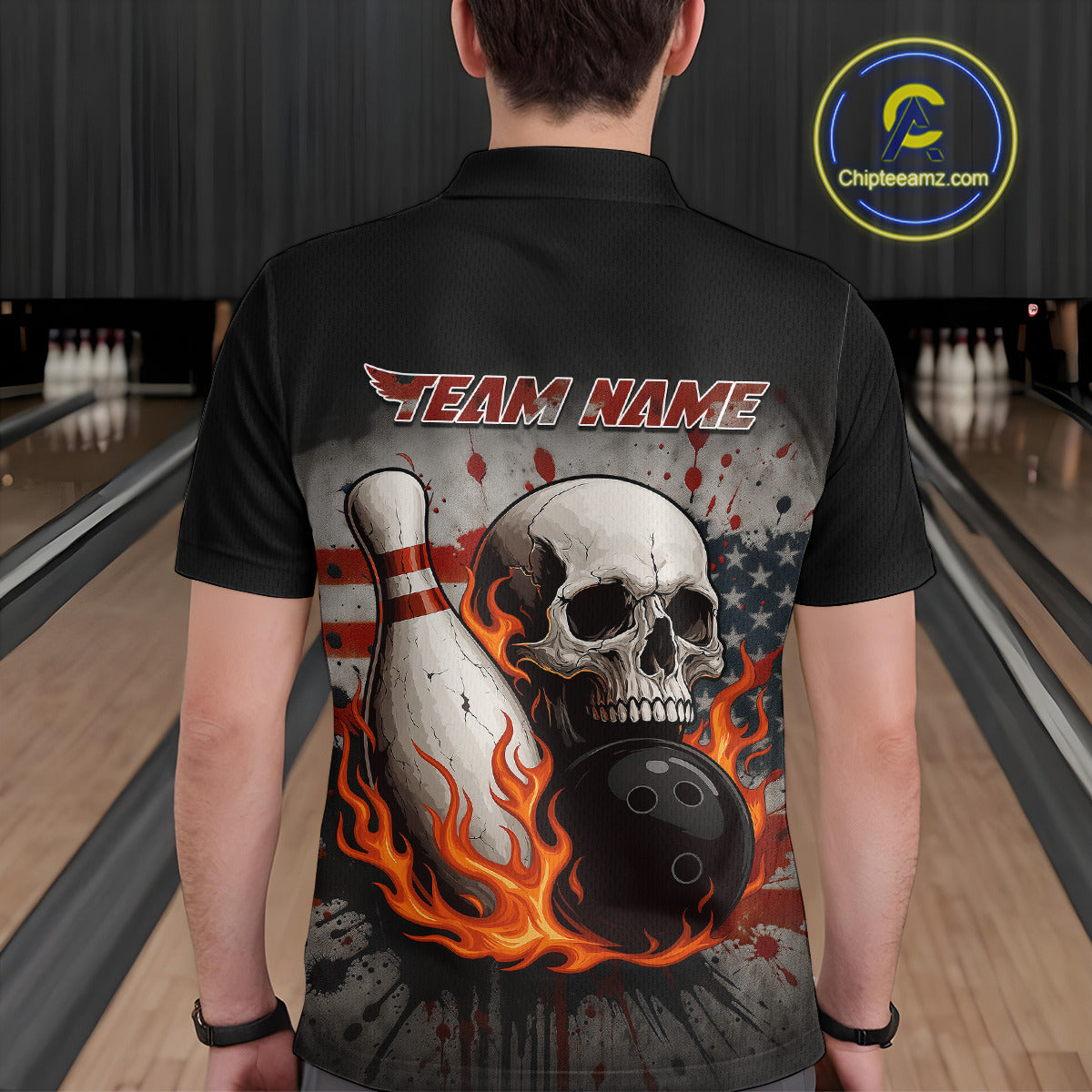 Personalized American Flag Flame Skull Bowling Shirts For Men Custom Patriotic Bowling Team Jersey NQS10462