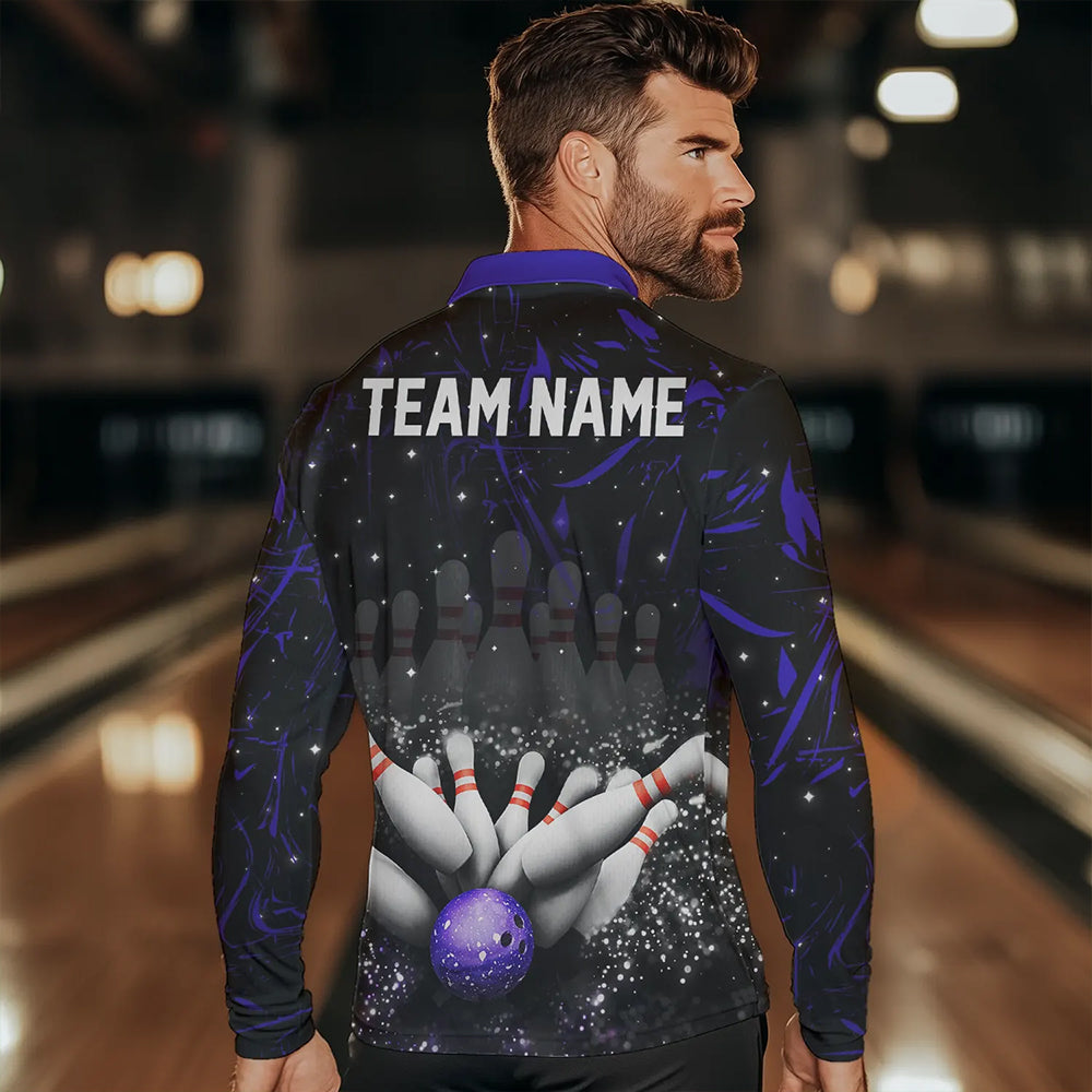 Personalized Black and Purple Camo Bowling Polo, Quarter Zip Shirts For Men Custom Bowling Team Jersey NQS9687