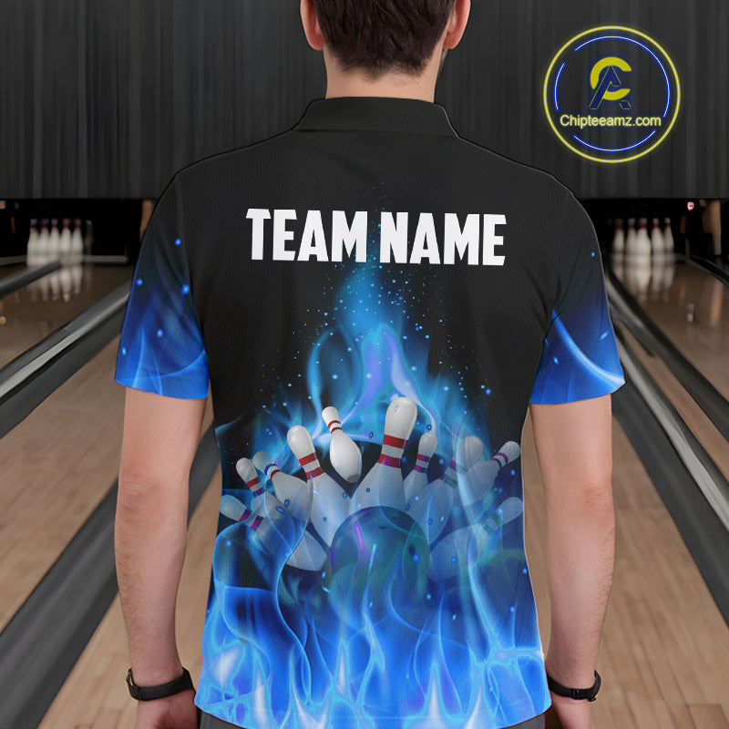 Personalized Mens Bowling Shirt Blue flame Bowling Ball and Pins Team bowling jerseys for men Bowler NQS10471