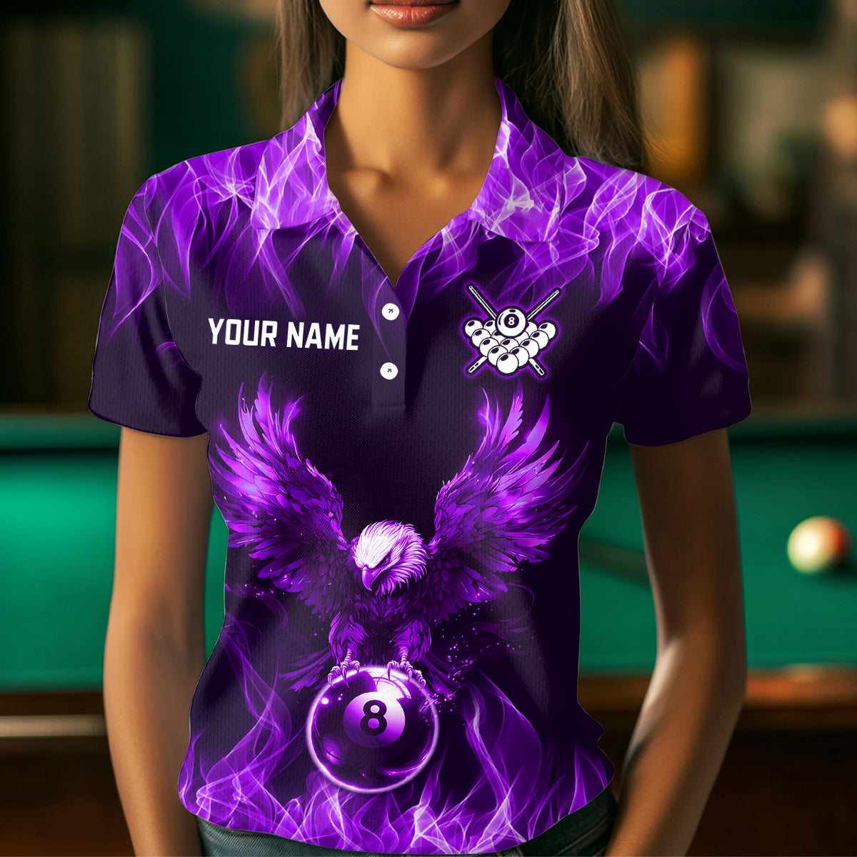 Personalized Purple Eagle Flaming 8 Ball Pool Bliiard Polo & 1/4 Zip, Billiard Shirt for Women, Billiard Team Jerseys NNT36