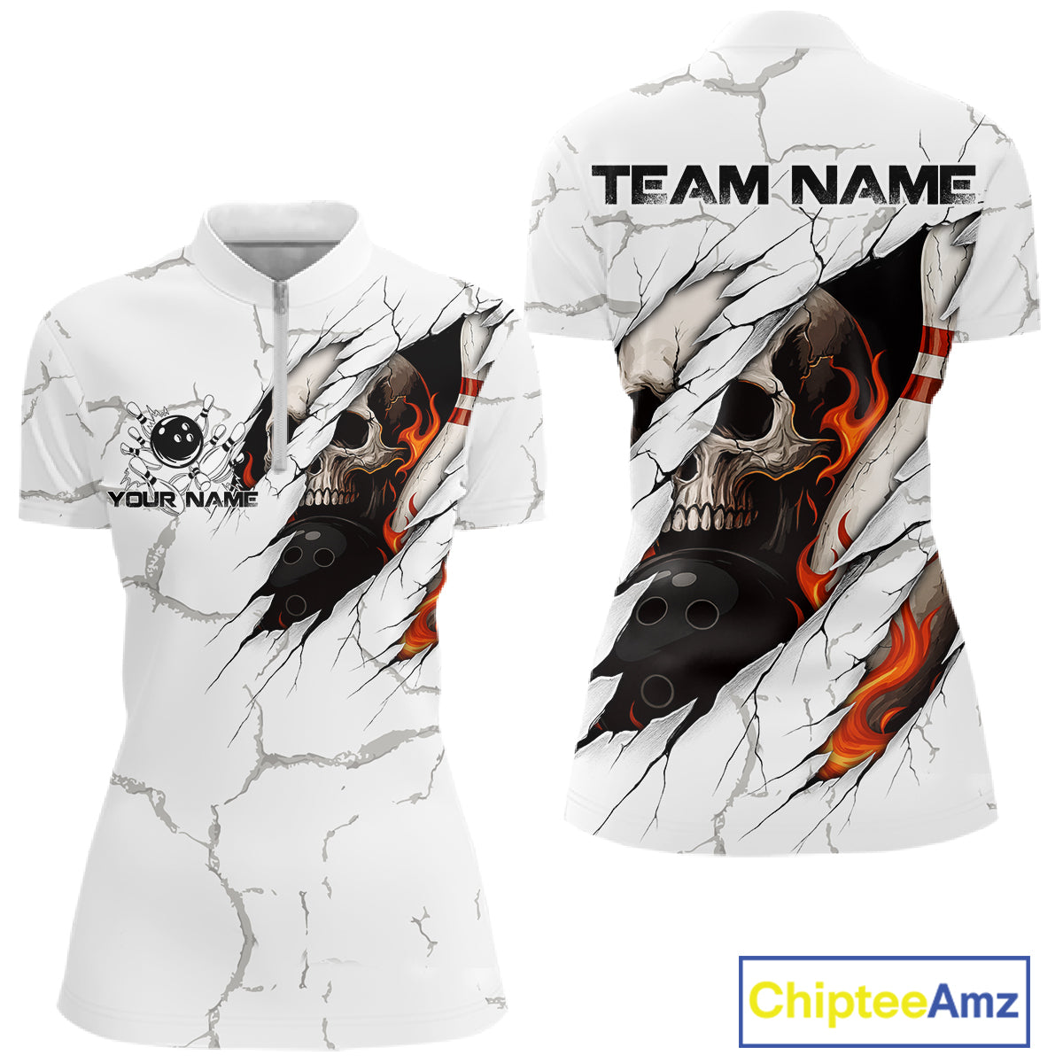 Personalized White Grunge Flame Skull Bowling shirts for Women Custom Team Bowling League Shirts NQS10536