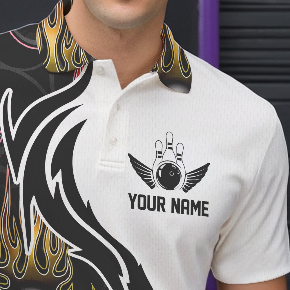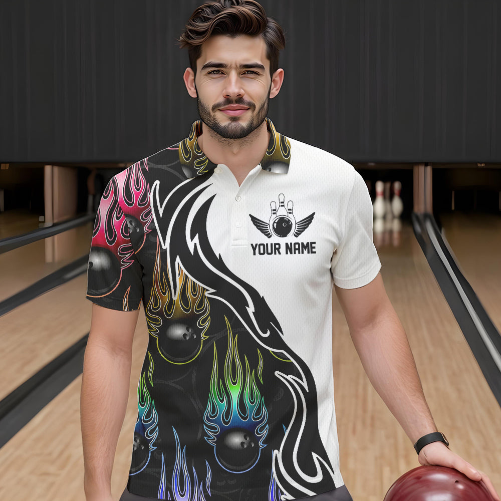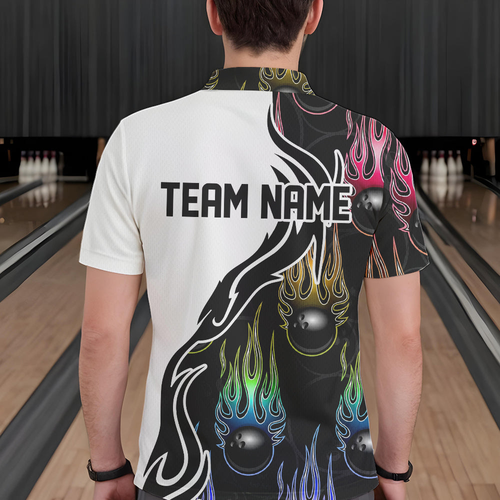 Colorful Rainbow Flame Ball Custom Bowling Team Men Polo Shirts, Fire Bowling League Shirt IPHW8865