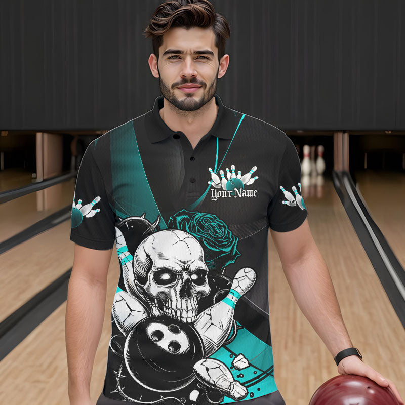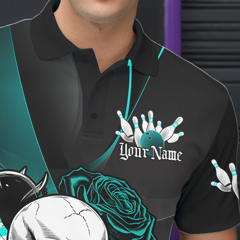 Custom Black And Blue Roses Skull Bowling Team Polo Shirts For Men, Skull Bowling Jerseys IPHW8872
