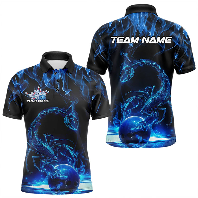 Custom Black And Blue Flame Scorpio Zodiac Bowling Men Polo Shirts, Scorpion Bowling Team IPHW8969