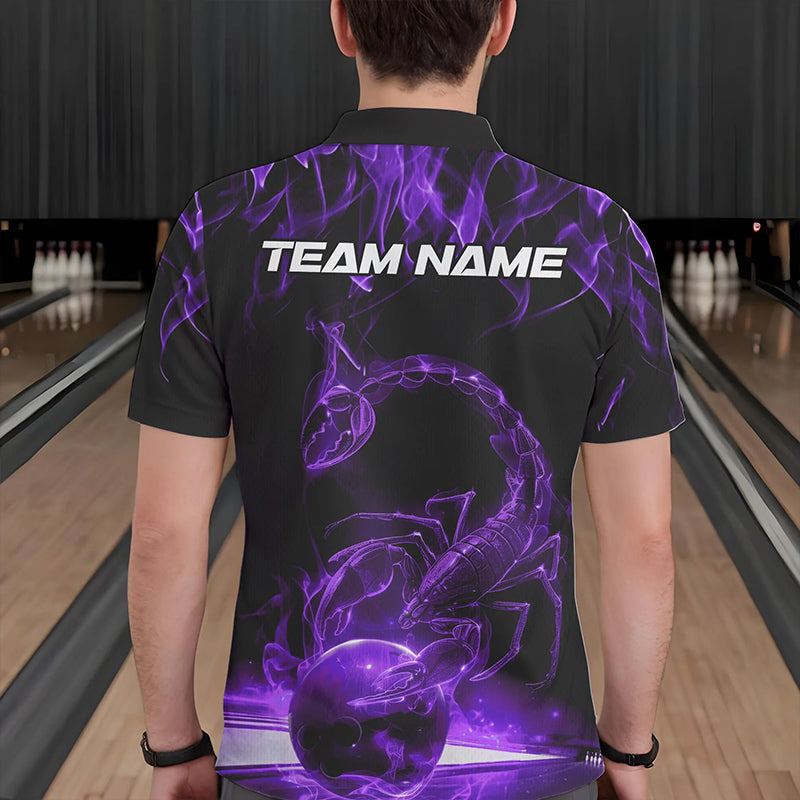 Custom Black And Purple Flame Scorpio Zodiac Bowling Men Polo Shirts, Scorpion Bowling Team IPHW8971