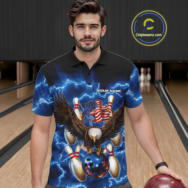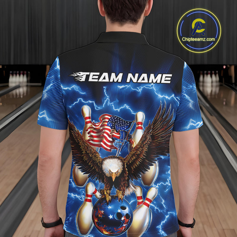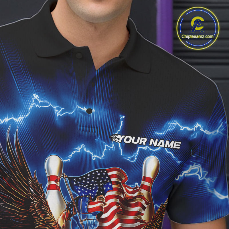 Custom Blue Lightning US Flag Eagle Bowling Team Polo Shirts For Men, Patriotic Bowling IPHW9479