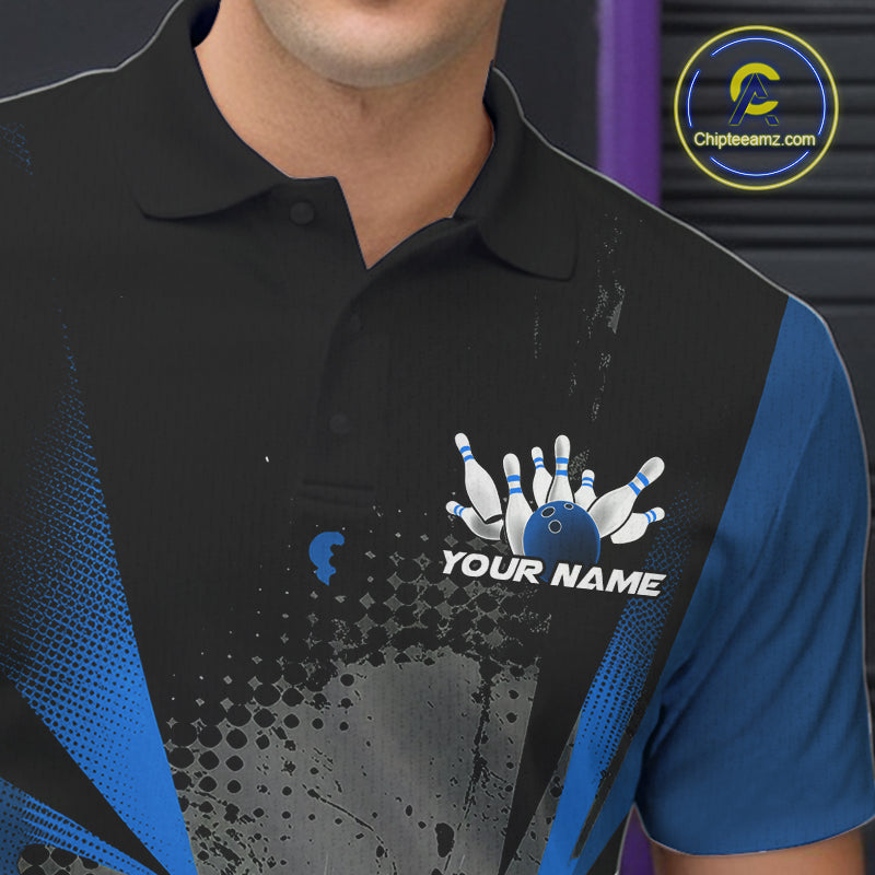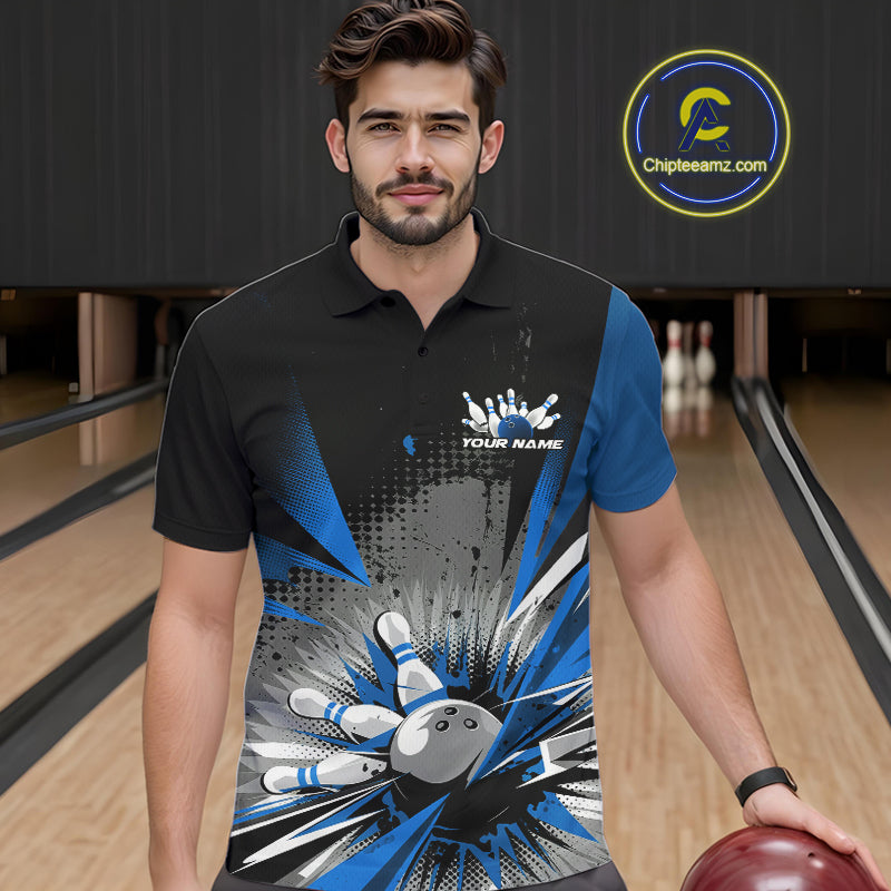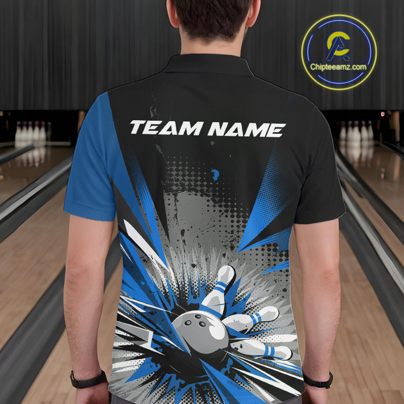 Custom Black And Blue Grunge Bowling Ball And Pins Explosion Team Polo Shirts For Men IPHW9548