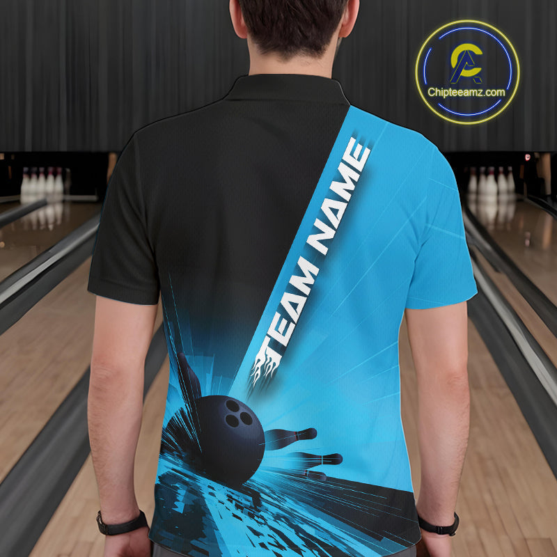 Custom Black And Blue Strike Bowling Polo Shirts For Men, Bowling Team Uniform IPHW9552